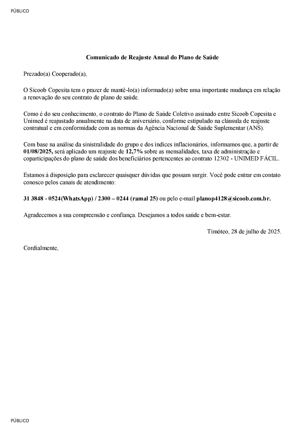 Carta de Reajuste Plano de Saúde
