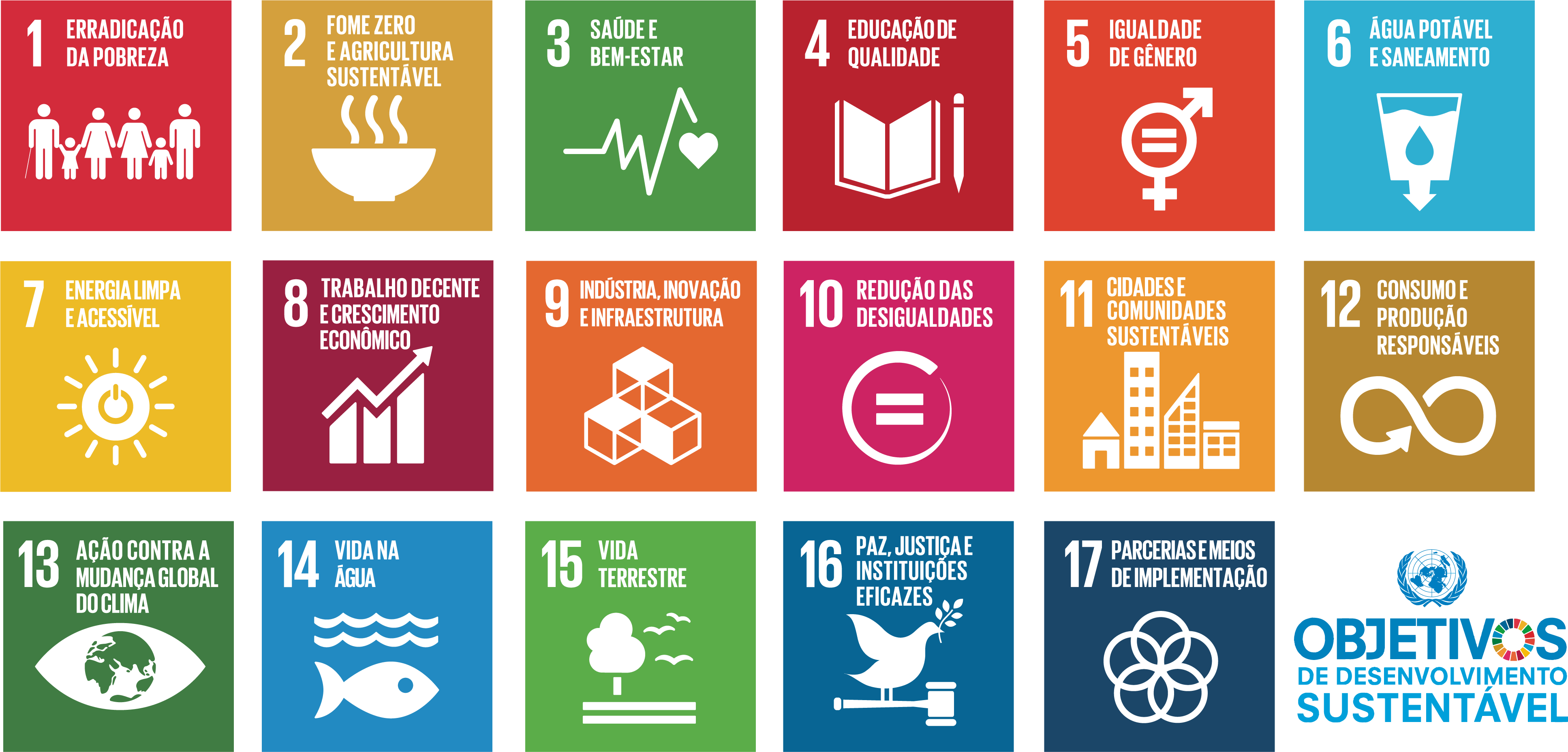 Quais são os ODS?01 – Erradicação da pobreza: acabar com a pobreza em todas as suas formas, em todos os lugares. 02 – Fome zero e agricultura sustentável: acabar com a fome, alcançar a segurança alimentar e melhoria da nutrição e promover a agricultura sustentável. 03 – Saúde e bem-estar: assegurar uma vida saudável e promover o bem-estar para todos, em todas as idades. 04 – Educação de qualidade: assegurar a educação inclusiva, e equitativa e de qualidade, e promover oportunidades de aprendizagem ao longo da vida para todos. 05 – Igualdade de gênero: alcançar a igualdade de gênero e empoderar todas as mulheres e meninas. 06 – Água limpa e saneamento: garantir disponibilidade e manejo sustentável da água e saneamento para todos. 07 – Energia limpa e acessível: garantir acesso à energia barata, confiável, sustentável e renovável para todos. 08 – Trabalho decente e crescimento econômico promover o crescimento econômico sustentado, inclusivo e sustentável, emprego pleno e produtivo, e trabalho decente para todos. 09 – Inovação infraestrutura: construir infraestrutura resiliente, promover a industrialização inclusiva e sustentável, e fomentar a inovação. 10 – Redução das desigualdades: reduzir as desigualdades dentro dos países e entre eles. 11 – Cidades e comunidades sustentáveis: tornar as cidades e os assentamentos humanos inclusivos, seguros, resilientes e sustentáveis. 12 – Consumo e produção responsáveis: assegurar padrões de produção e de consumo sustentáveis. 13 – Ação contra a mudança global do clima:tomar medidas urgentes para combater a mudança climática e seus impactos (*). 14 – Vida na água: conservação e uso sustentável dos oceanos, dos mares, e dos recursos marinhos para o desenvolvimento sustentável. 15 – Vida terrestre: proteger, recuperar e promover o uso sustentável dos ecossistemas terrestres, gerir de forma sustentável as florestas, combater a desertificação, deter e reverter a degradação da Terra e deter a perda da biodiversidade. 16 – Paz, justiça e instituições eficazes: promover sociedades pacíficas e inclusivas par ao desenvolvimento sustentável, proporcionar o acesso à justiça para todos e construir instituições eficazes, responsáveis e inclusivas em todos os níveis. 17 – Parcerias e meios de implementação: fortalecer os meios de implementação e revitalizar a parceria global para o desenvolvimento sustentável. |