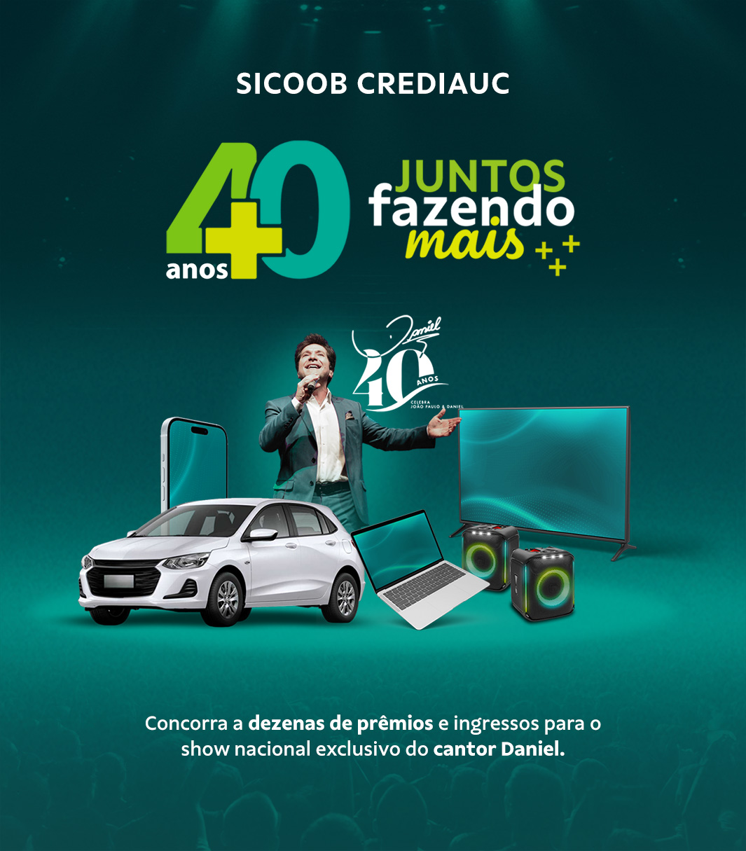 A promoção comercial “Sicoob Crediauc 40 anos: Juntos fazendo mais” é realizada pela cooperativa Sicoob Crediauc, com sede na cidade de Concórdia/SC.
