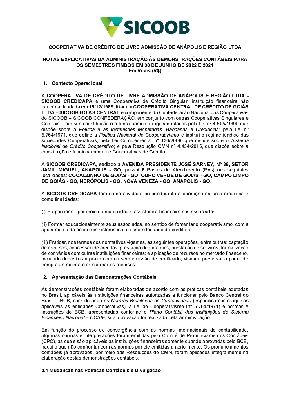 NOTAS EXPLICATIVAS DA ADMINISTRAÇÃO - Sicoob Credicapa