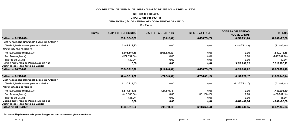 Relatório 1° Semestre 2022 - DEMONSTRAÇAO DAS MUTAÇÕES DO PATRIMÔNIO LÍQUIDO