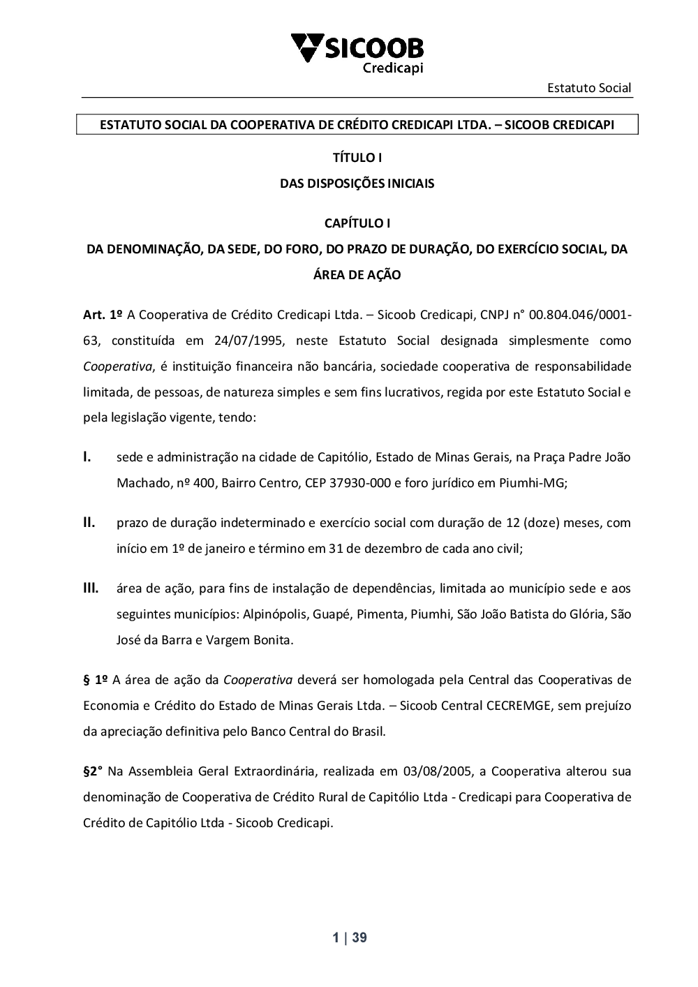 ESTATUTO SOCIAL DA COOPERATIVA DE CRÉDITO CREDICAPI LTDA. – SICOOB CREDICAPI