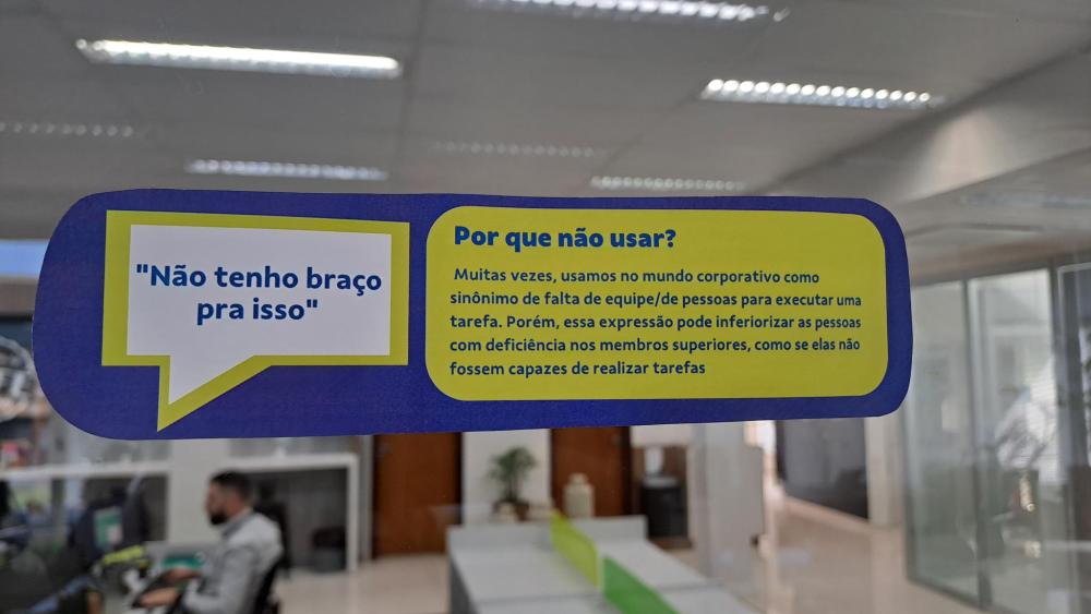 Também, na Unidade Administrativa da instituição, foram espalhadas por murais e paredes algumas expressões utilizadas no dia a dia e o motivo para não as usar, como “não tenho braço para isso”, além da ambientação de uma sala sensorial.