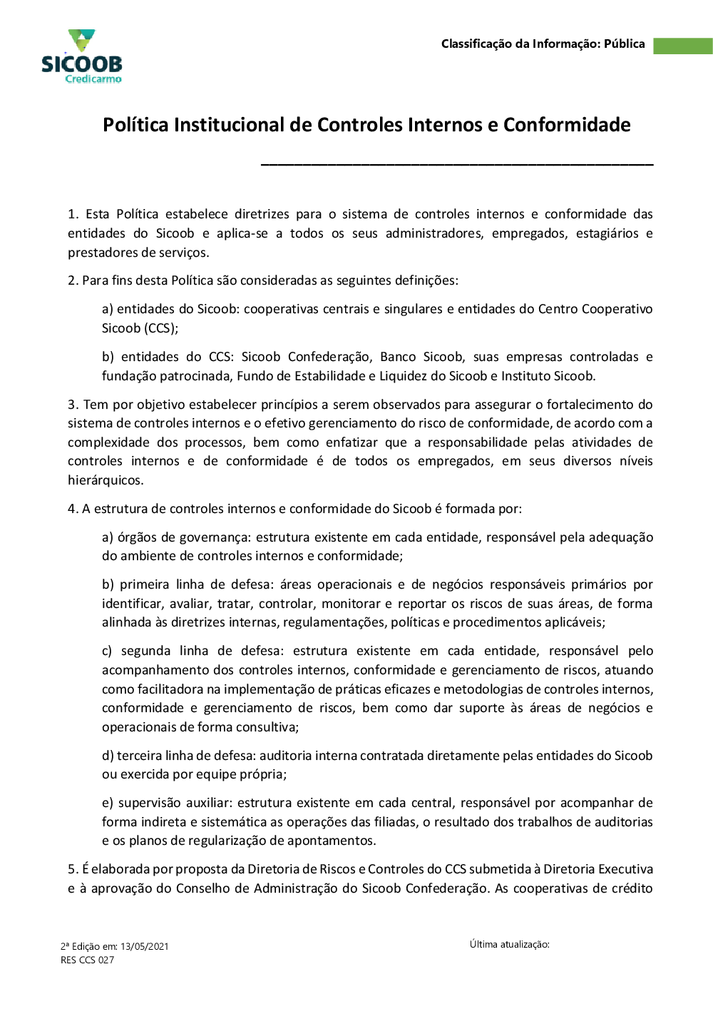 Sicoob Central CrediminasCooperativa Central de Crédito de Minas Gerais Ltda.Av. Del Rey, 111 Torre B - Caparaó - 30775-240 - Belo Horizonte - MGTel. (31) 3270 7600