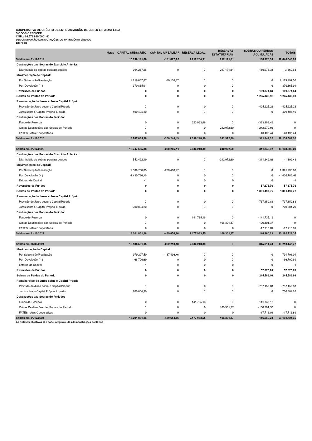 DEMONSTRAÇÃO DAS MUTAÇÕES DO PATRIMÔNIO LÍQUIDO - Sicoob Credicer - 31.12.2021