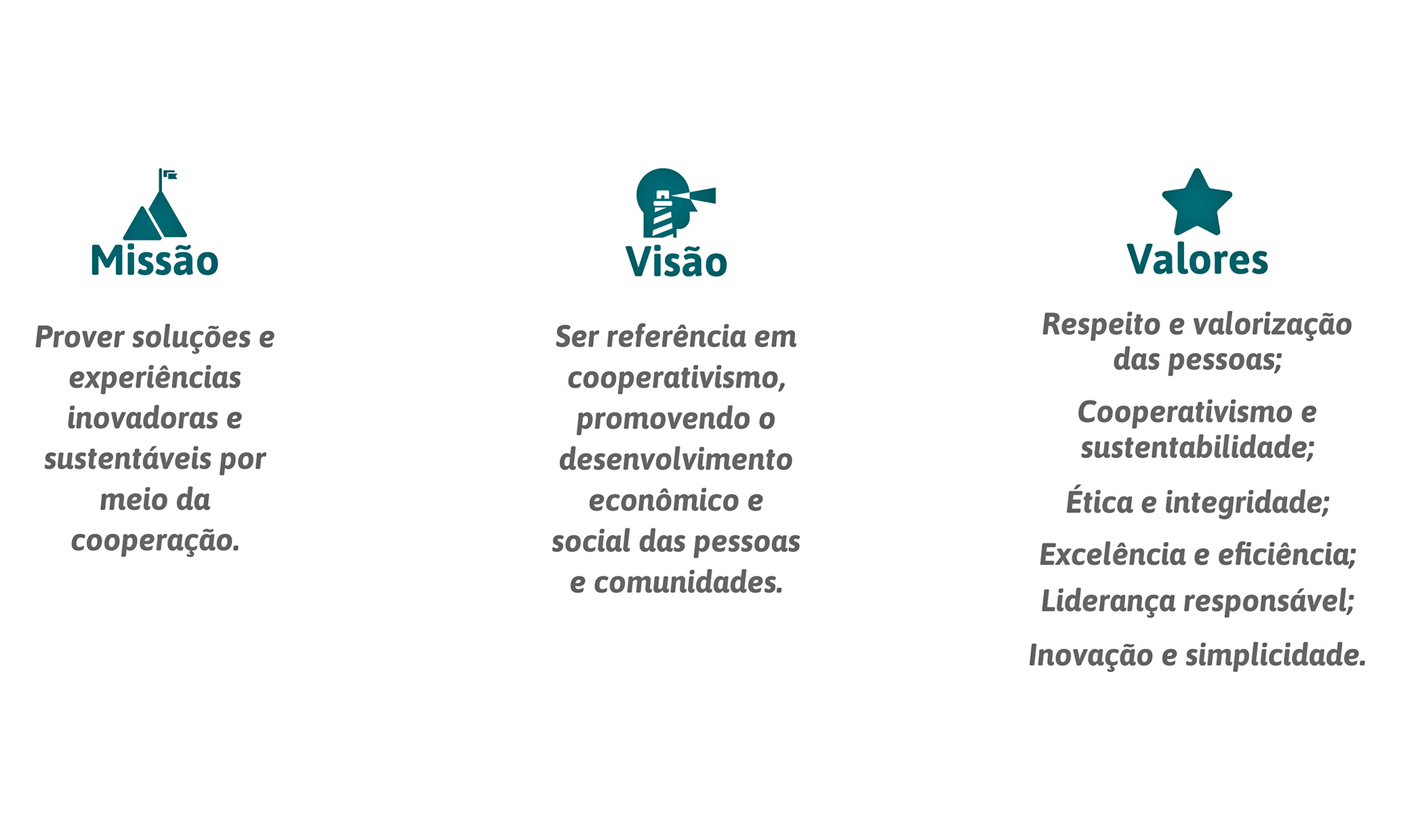 Firmemente pareados ao Sistema Sicoob nos ideais e práticas da cooperação, pertencimento, responsabilidade social e justiça financeira, sempre ressaltamos aos nossos cooperados e não-cooperados que quem se associa não é apenas um cliente: é um cooperado e, como dono do empreendimento, participa democraticamente das decisões e dos resultados financeiros – resultados esses que são reinvestidos no desenvolvimento regional, em um círculo virtuoso de prosperidade socioeconômica.