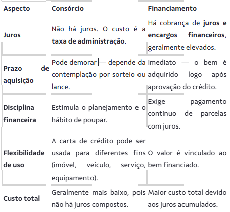 Embora ambos sejam formas de conquistar um bem de alto valor, consórcio e financiamento funcionam de maneiras bem diferentes. Veja as principais distinções: