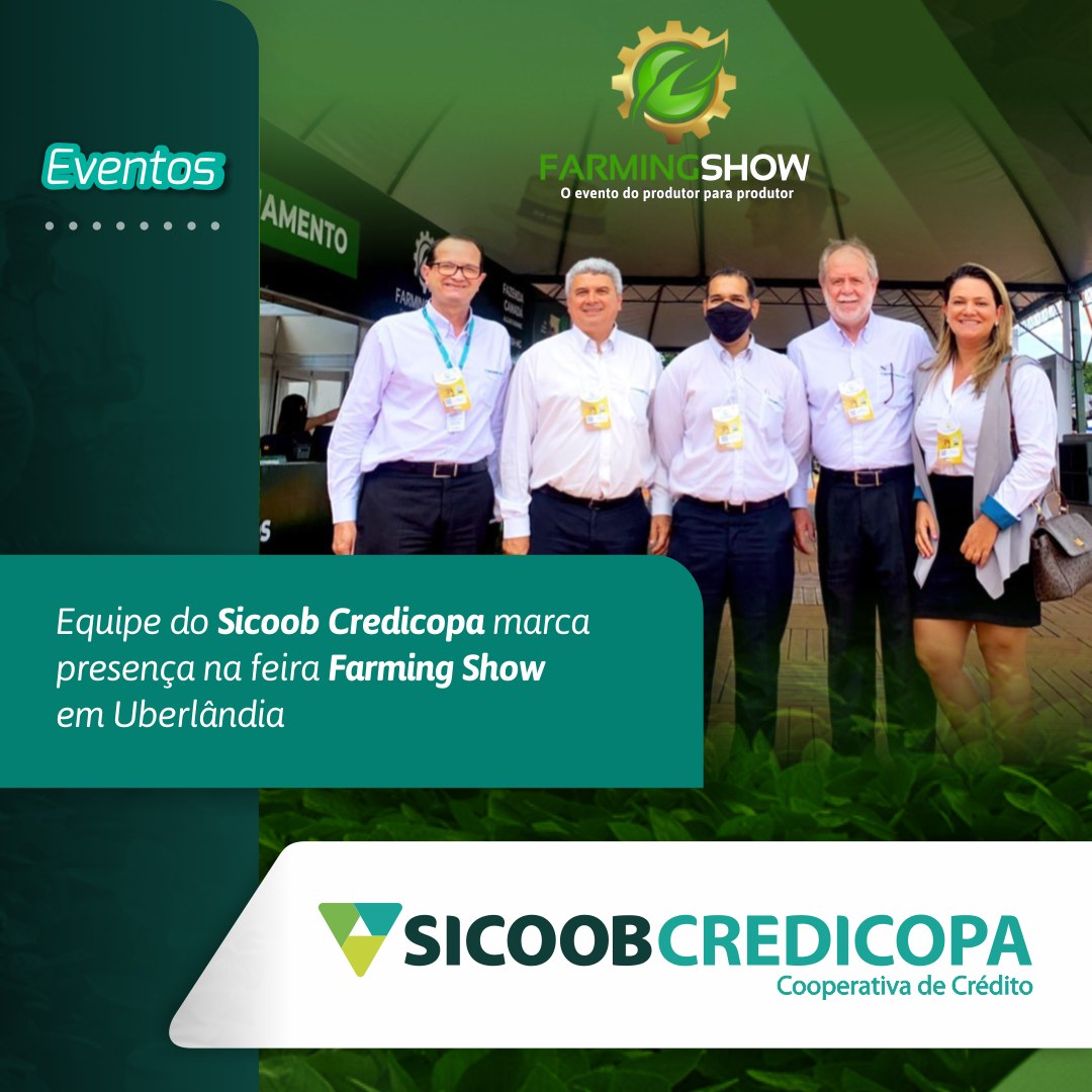 Os gerentes, do Sicoob Credicopa, José Edgar, Claudio, Mauricio e Gisele das agências de Uberlândia e o superintendente José Altamir, marcaram presença na FarmingShow, um evento que proporciona a melhor experiência de campo para quem acredita no agro. A cooperativa segue com o propósito em buscar e levar conhecimento e apoio aos produtores rurais que bravamente estão contribuindo para a recuperação da nossa economia.