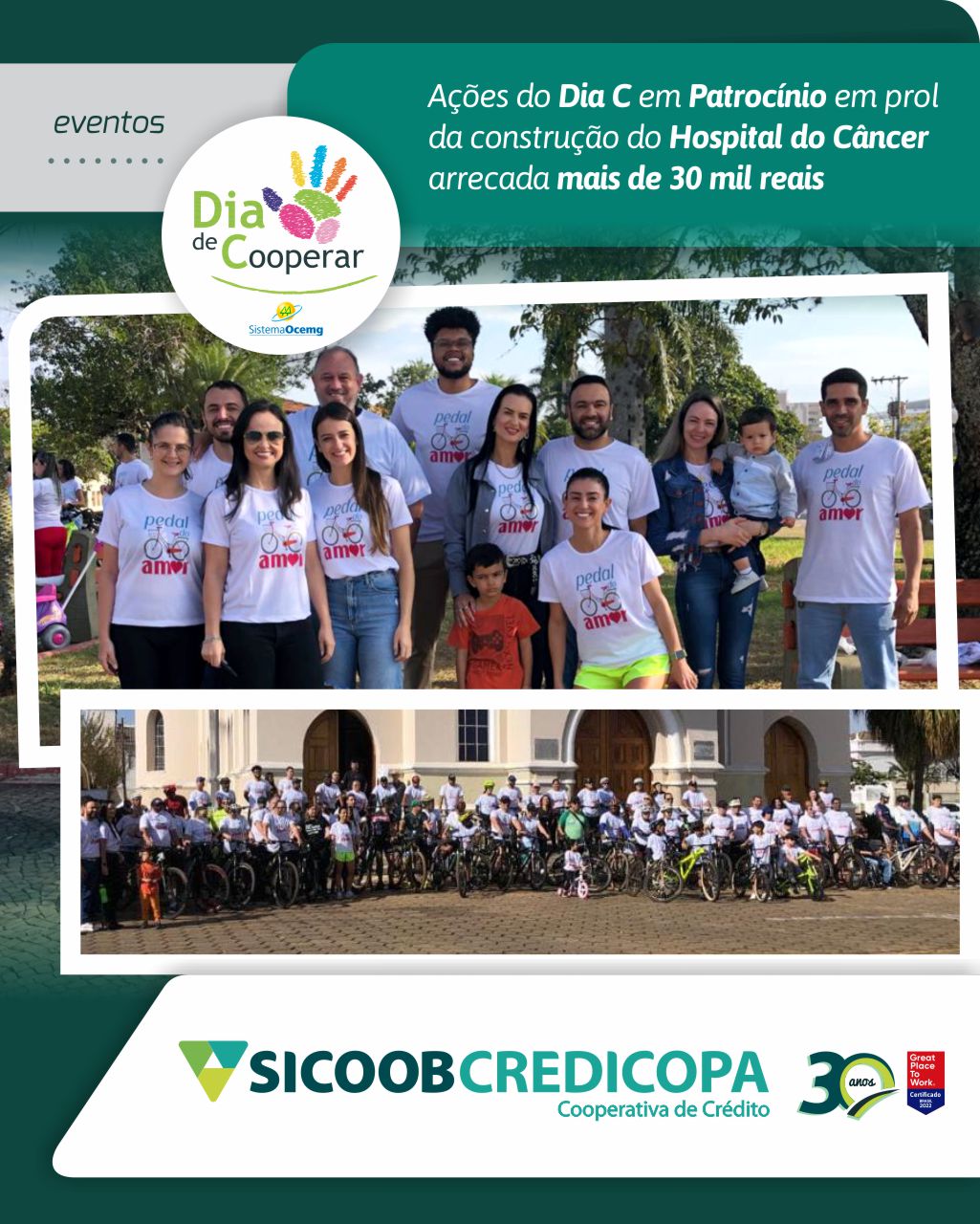 O Sicoob Credicopa junto ao Grupo Amigos do Bem, e as cooperativas Expocacer, Unimed, Coopa, e Unicred, agradecem todos que engajaram nesta causa especial em comemoração ao Dia de Cooperar! #DiaC Foram duas ações realizadas durante o mês de agosto e setembro. Houve o Pedal do Amor no qual a comunidade adquiriu a camiseta solidária por R$20,00 e no dia 16/07 se reuniram na Praça Matriz para a pedalada do bem. Houve também a venda de rifa (Ação Entre Amigos) no valor de R$10,00 na qual sorteou um iPhone 13. O total arrecadado nas ações foi de R$ 30.190,00 e será repassado para o Hospital do Câncer.