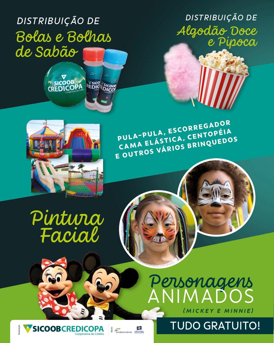 Neste sábado (12/10), esperamos a criançada para distribuição de bolas, ioiôs, pipocas, algodão doce, haverá pintura facial, a presença dos personagens da Mickey e Minnie, das 09h às 12h, na Praça do Coreto. O Dia das Crianças será de pura diversão. A carreta Trem Bala ficará estacionada em frente à Praça do Fórum a partir das 09 às 14h e 15 às 19h. Crianças menores de 12 anos de idade devem estar acompanhados de um responsável para realizar o passeio e ambos devem apresentar ingresso. Venha se divertir com a gente!