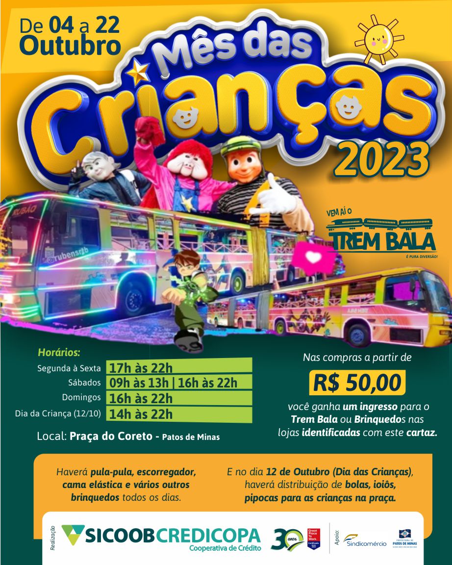 Vai ser um fantástico mundo de alegria durante os dias 04 até 22 de outubro. Comprando a partir de R$ 50,00 nas lojas identificadas, você ganha um ingresso na hora para usar na carreta TREM BALA ou nos brinquedos. A carreta Trem Bala ficará estacionada em frente à Praça do Fórum. Os passeios vão durar cerca de 30 minutos, de segunda à sexta das 17h às 22h, aos sábados das 9h às 13h e 16h às 22h, aos domingos das 16h às 22h e no dia da criança das 14h às 22h. Além da carreta, a criançada também poderá se divertir nos brinquedos na Praça, vai ter: pula-pula, escorregador, cama elástica, centopeia e tobogã. E no dia 12 de outubro, na Praça do Coreto, das 17h às 20h, o Sicoob Credicopa em comemoração ao Dia das Crianças distribuirá bolas, ioiôs e pipocas. Este ano, contamos com a parceria do Sindcomércio/Sesc que fará uma ação na Praça do Coreto, no dia 06 de outubro, com muitas brincadeiras. O projeto Espaço de Lazer contará com brinquedos, brincadeiras, atividades lúdicas e oficinas, além de jogos recreativos, desportivos e eletrônicos para que as famílias e a comunidade possam se divertir juntas. Toda a renda do projeto será destinada ao Fundo para Infância e Adolescência de Patos de Minas (FIA).