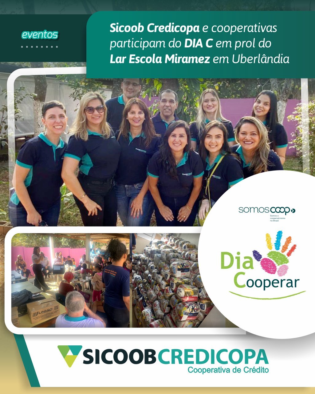 No sábado (29/06), a solidariedade e a cooperação marcaram o Dia de Cooperar – Dia C, em Uberlândia. As cooperativas Sicoob Creditril, Sicoob Credicopa, Unicred Aliança, Uniodonto Minas, Unipsico, Calu e Unimed Uberlândia realizaram, das 8 às 11 horas, uma ação solidária no Lar Escola Miramez, que atende cerca de 80 famílias carentes, no bairro Morada Nova. O evento marcou a entrega das doações da campanha solidária promovida pelas cooperativas, ao longo de todo o mês de junho. Alimentos e roupas foram arrecadados pelas instituições e para realizar a distribuição dos donativos, as cooperativas realizaram um café da manhã para os assistidos. Além do lanche, foram realizadas ações na área da saúde e educação financeira. Dentre as atividades programadas aconteceu uma palestra sobre Educação Financeira para cerca de 100 crianças atendidas pela instituição. Além disso, as cooperativas conseguiram uma parceria com a Associação Renovando Laços, que ofereceu exames oftalmológicos gratuitos às famílias assistidas. A entidade é conhecida por promover desenvolvimento saudável e intelectual às famílias de baixa renda. A Uniodonto Minas levou o Odontomóvel, unidade móvel equipada com um consultório odontológico que promoveu ação de educação e prevenção em saúde bucal.