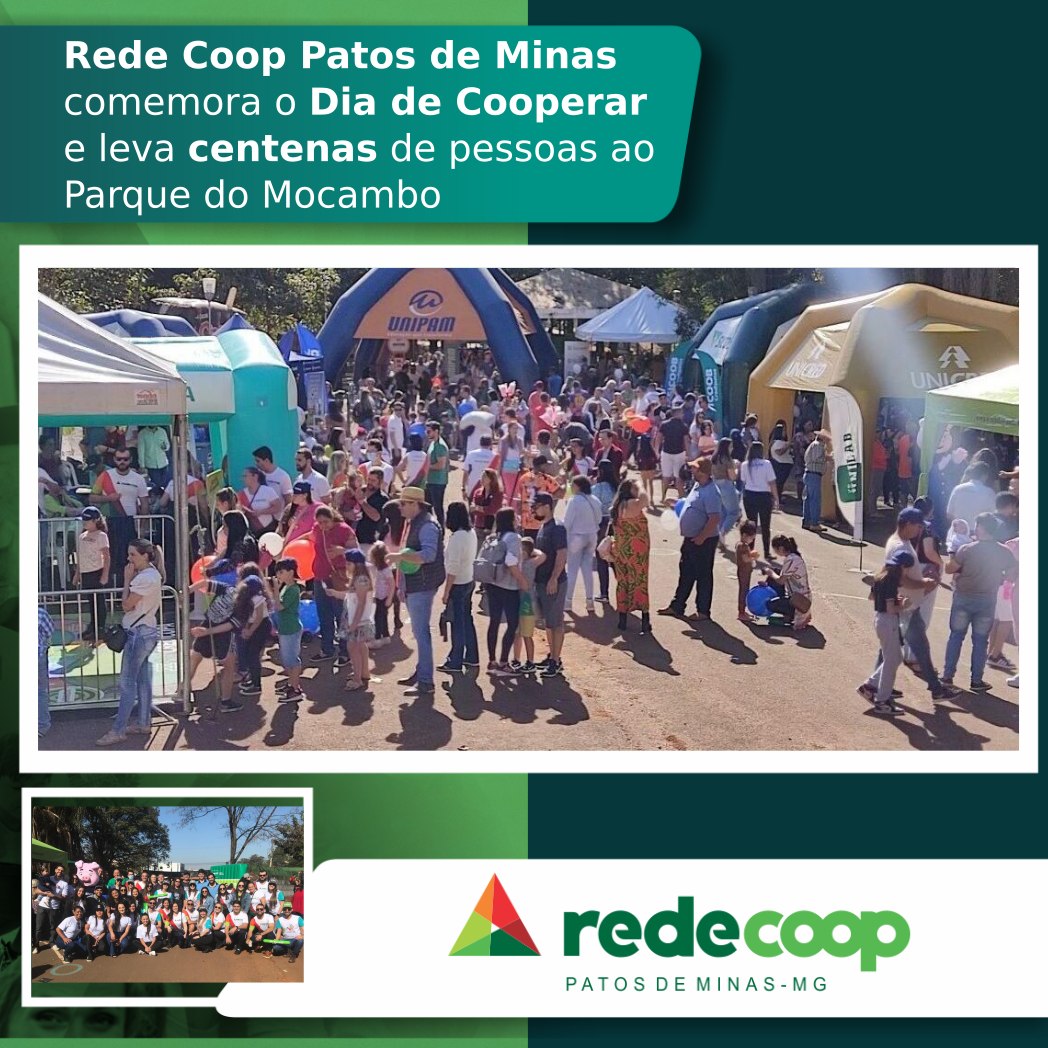 O Sicoob Credicopa junto a Rede Coop Patos de Minas e parceiros comemoraram o Dia de Cooperar na manhã de sábado (02/07) com muitas atividades no Parque Municipal do Mocambo. A programação contou com brincadeiras, ações educativas (financeiras e cooperativistas) e de promoção da saúde e distribuição de brindes. A responsabilidade social está no DNA das 13 cooperativas, bem como dos membros em que as compõem, privilegiando o bem-estar comum e a busca pela construção de um mundo mais justo e igualitário. Esse conceito permeia as atividades do cooperativismo. O movimento alinhado ao 7º princípio cooperativista – interesse pela comunidade - tem como proposta cuidar das pessoas, das regiões onde existem cooperativas, preservar o meio ambiente, fomentar a sustentabilidade e realizar ações nas quais todos possam se beneficiar por meio do compartilhamento de experiencias de voluntariado e solidariedade. O Dia de Cooperar (Dia C) nasceu em 2009 como um projeto inovador, realizado pelo Sistema OCEMG. O Sicoob Credicopa em Uberaba, com o grupo Intercooperação, participou da Inauguração de uma academia ao ar livre. A academia foi um projeto do grupo para atender a população que frequenta a FETI -Fundação de Ensino Técnico Intensivo Dr. Renê Barsam.