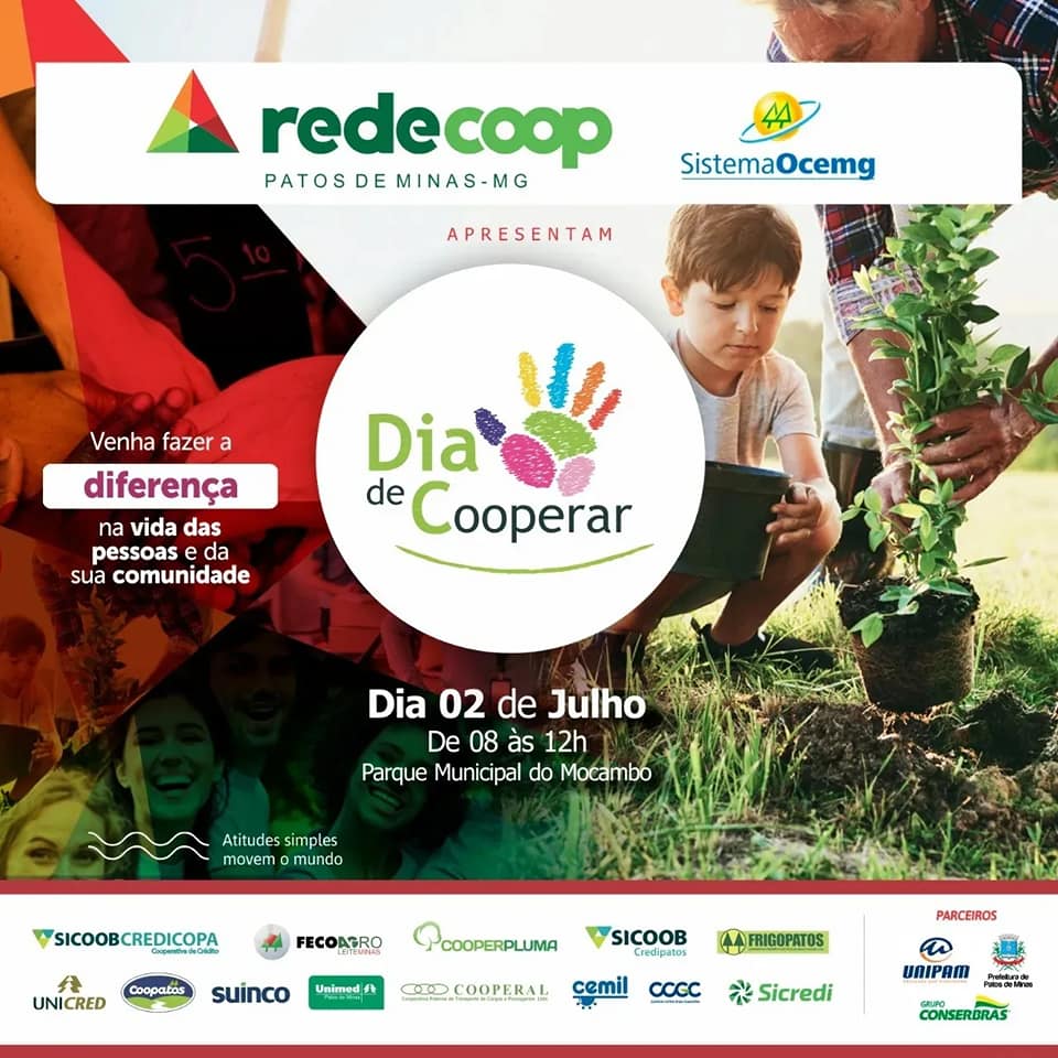 Marque na agenda! 2 de julho, das 8 às 12h, tem #DiaC no Parque Municipal do Mocambo em Patos de Minas. Será uma manhã de sábado com muito lazer e descontração para toda a família. Vai ter recreação infantil, degustação, dicas de saúde e bem-estar e uma programação especial. A Rede Coop Patos de Minas, união das 13 cooperativas do município, e parceiros Unipam, Conserbrás e Prefeitura Municipal de Patos de Minas estarão juntas em prol de uma grande corrente do bem. Vamos unir forças nesse dia incrível! Evento gratuito e aberto ao público.