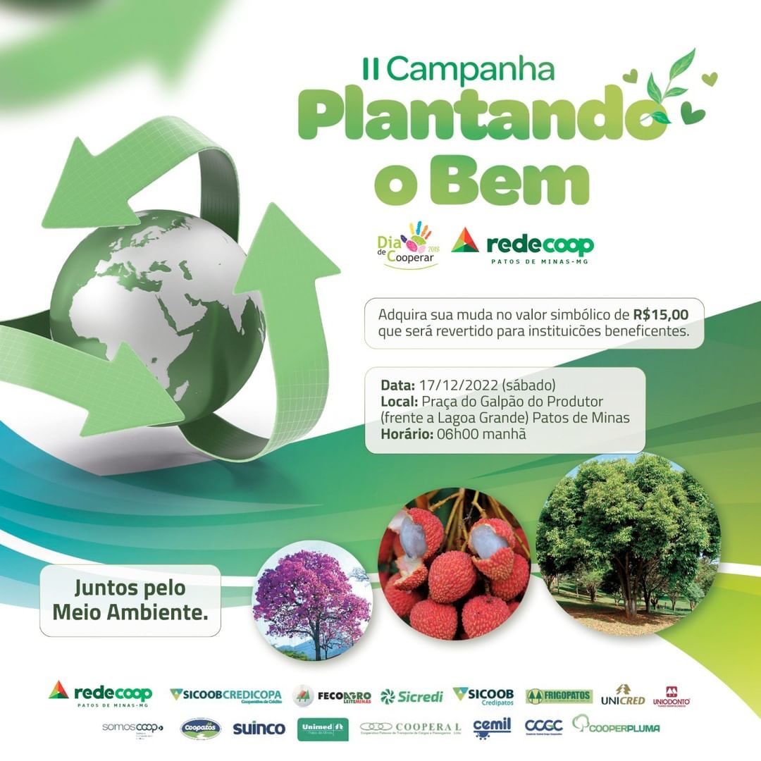 Chegou a 2ª Edição da Campanha Plantando o Bem! 🌱🤲👩🌾 A campanha promovida pela Redecoop Patos de Minas consiste na venda de mudas de diversas espécies a um valor simbólico que será revertido para instituições beneficentes de Patos de Minas. O objetivo é fomentar a consciência ambiental e social na sociedade patense! A ação acontecerá neste sábado, dia 17/12, na Praça do Galpão do Produtor (frente a Lagoa Grande), a partir das 6h da manhã! Venha participar deste momento conosco!