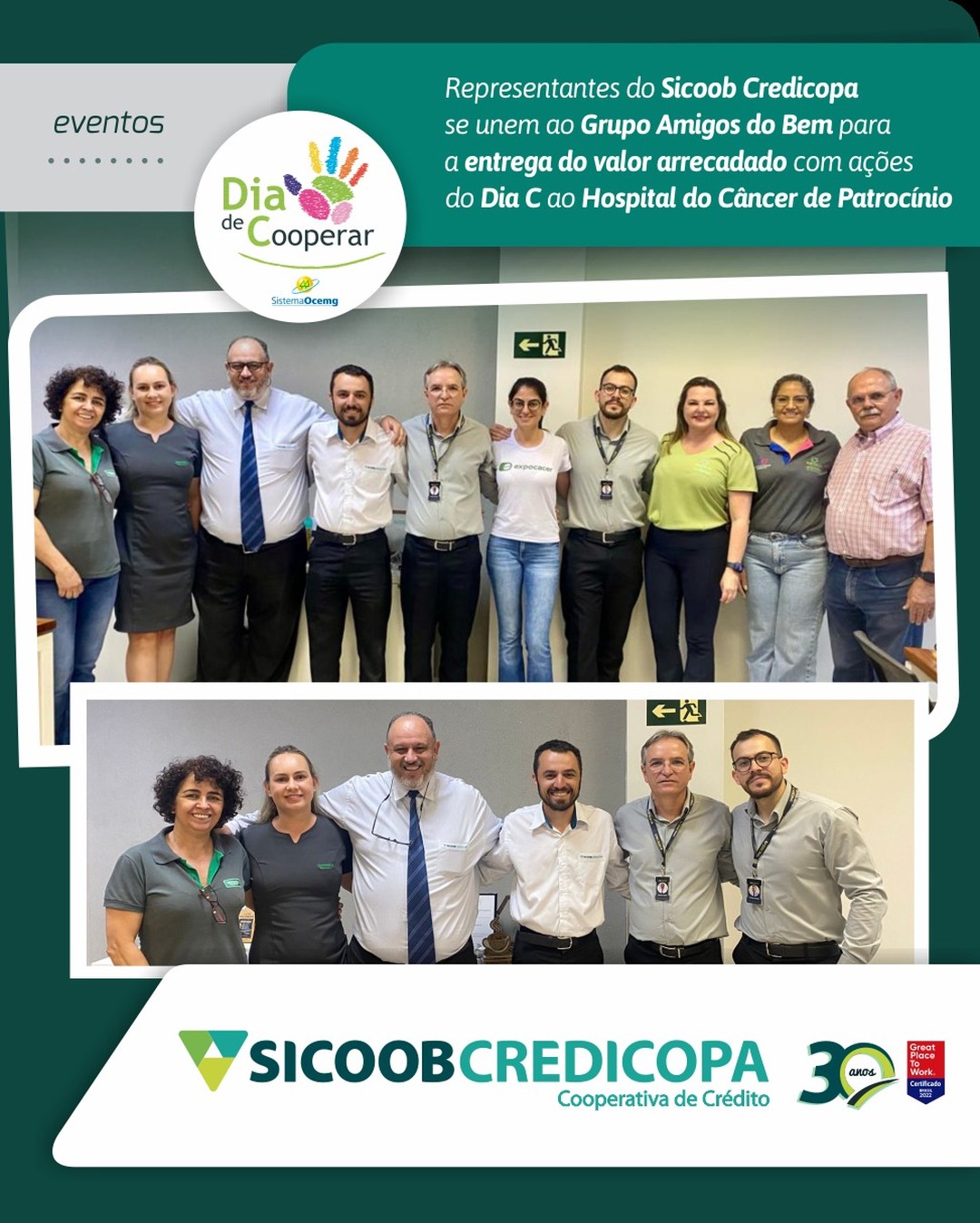 Na terça-feira, dia 26/09, o Sicoob Credicopa junto as cooperativas Coopa, Expocacer, Unicred e Unimed se uniram ao Grupo Amigos do Bem para a entrega do valor arrecadado com ações do Dia C (Dia de Cooperar) para o Hospital do Câncer de Patrocínio. Nos últimos meses, estiveram engajados vendendo camisetas e rifas em prol da construção do hospital. O total arrecadado nas ações foi de R$ 30.230,00, sendo R$ 11.040,00 provenientes da venda das camisetas do Pedal do Amor e R$ 19.190,00 das rifas. Agradecemos a todos que se uniram a nós nessa nobre causa.