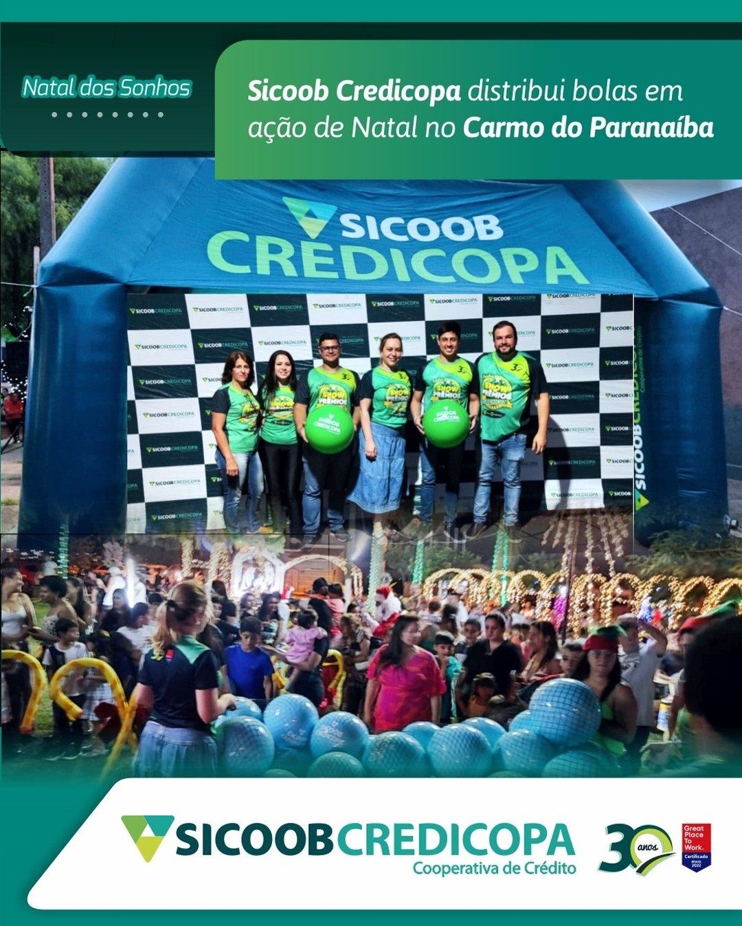 No domingo (10/12) o Sicoob Credicopa distribuiu bolas na Praça Iluminada de Carmo do Paranaíba. A equipe de voluntários transformadores da cooperativa distribuiu mais de 500 bolas. A noite também foi marcada pela magia das luzes e a alegria do bom velhinho Papai Noel. O Sicoob Credicopa abraçou o projeto do Lions Clube Maurício Rios com a iluminação da Praça e ações natalinas que encantam moradores e visitantes. É um prazer fazer parte e contribuir como patrocinador. É assim que deixamos nossa marca e convidamos a todos para vivenciar este momento. Visite a Praça Iluminada, faça lindas fotos para eternizar e compartilhe conosco.