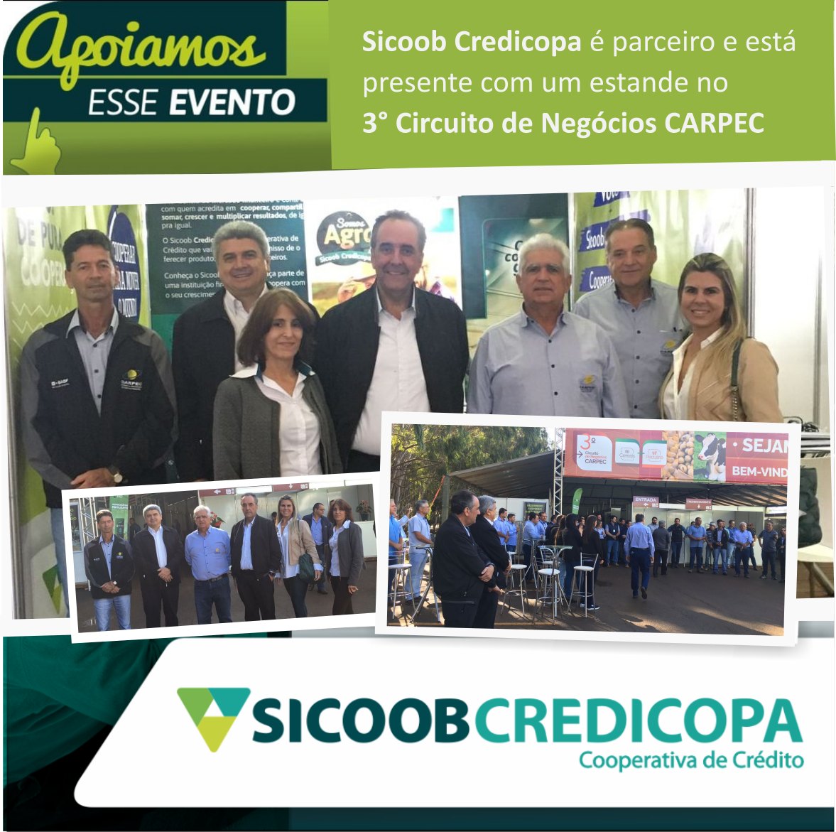 Nesta terça-feira (12/07), o presidente do Sicoob Credicopa Ronaldo Siqueira Santos, o superintendente José Altamir de Queiroz Braga e as gerentes Adelci De Fatima Elias Costa e Marilia Coury Moreira Fonseca, marcaram presença na abertura do 3º Circuito de Negócios Carpec. Os representantes do Sicoob Credicopa prestigiaram a solenidade que contou com a participação do presidente da Carpec Tarcício Daniel da Silva, do vice-presidente Vanderlei Silva de Oliveira e do superintendente Hélder Boaventura. O Credicopa é parceiro e estará presente com um estande até 15 de julho. O Circuito acontece na cidade de Carmo do Paranaíba e de Tiros e conta com um completo portifólio de insumos e excelentes condições comerciais. Convidamos você, sua família e amigos para nos visitarem.