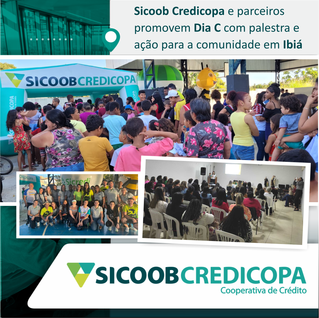 O Sicoob Credicopa, Sicredi e parceiros realizaram o Dia de Cooperar – Dia C em duas etapas na cidade de Ibiá. O primeiro encontro aconteceu no dia 11/07 em parceria com o Projeto Transformação, com uma palestra "O poder é delas" que falou sobre empreendedorismo e empoderamento feminino. Foi uma noite que contou com a presença de dezenas de mulheres. Houve distribuição e sorteio de brindes e ao final foi servido coffee break. O segundo encontro foi realizado no dia 23/07, na quadra esportiva do bairro Dona Maroca, em parceria com a Prefeitura Municipal de Ibiá. As cooperativas convidaram 650 famílias carentes para participarem de uma tarde com brincadeiras, sorteios de brindes e distribuição de lanche. Ações como essa são importantes para reforçar os pilares da cooperativa na comunidade que atuamos.