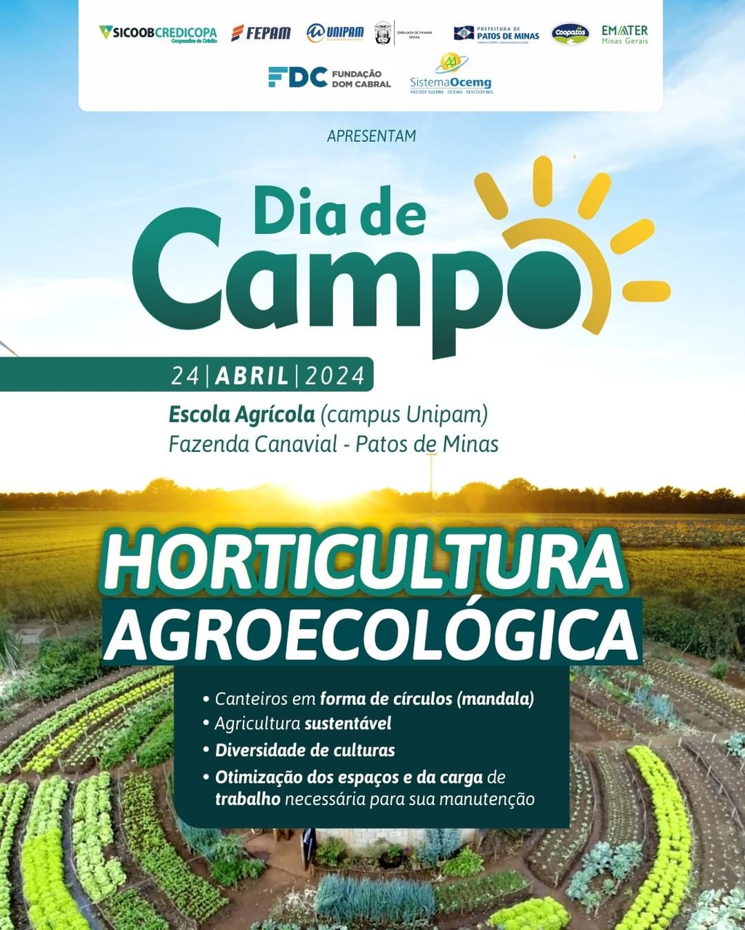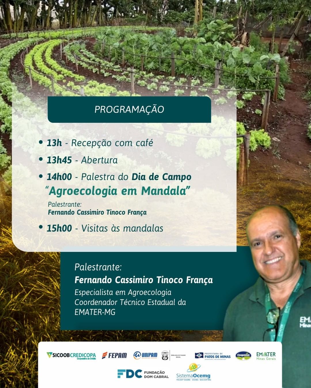 Sicoob Credicopa junto a Coopatos, Empresa de Assistência Técnica e Extensão Rural do Estado de Minas Gerais – Emater-MG, Prefeitura Municipal de Patos de Minas, Fundação Educacional de Patos de Minas – FEPAM, Centro Universitário de Patos de Minas – UNIPAM, Escola Agrotécnica Afonso Queiroz – Escola Agrícola, Sistema Ocemg e a Fundação Dom Cabral realizam Dia de Campo – Horticultura Agroecológica. O evento acontece nesta quarta-feira (24/04), na Escola Agrícola – Campus Unipam, às 13 horas. Além da palestra com Fernando Cassimiro Tinoco França, especialista em agroecologia e coordenador técnico estadual da EMATER-MG que irá falar sobre “Agroecologia em Mandala” haverá a visita nas Mandalas. A Mandala é um sistema de irrigação circular que facilita, de forma sustentável, a produção de diversas culturas de modo integrado, sem o uso de agrotóxicos e que promove educação ambiental através da capacitação dos produtores familiares, com conceitos de preservação e adoção de técnicas e práticas simples e de baixo custo. Também estimula a adoção de bons hábitos alimentares, assim como amplia a disponibilidade de produtos para complementar uma alimentação mais nutritiva e geração de renda. Segundo o diretor administrativo do Sicoob Credicopa Milton Roberto de Castro Teixeira o Projeto Mandala “possibilita o processo de cultivo dos alimentos de forma a valorizar a força de trabalho familiar e a conscientização da importância econômica da produção diversificada de alimentos saudáveis. O Sicoob Credicopa apoia mais esse projeto e auxiliará o produtor com as melhores taxas para criação do sistema”’. A cooperativa oferece um limite de crédito de até R$ 35.000,00 (trinta e cinco mil reais) com taxa selic + 3% ao ano em até 60 mensalidades.