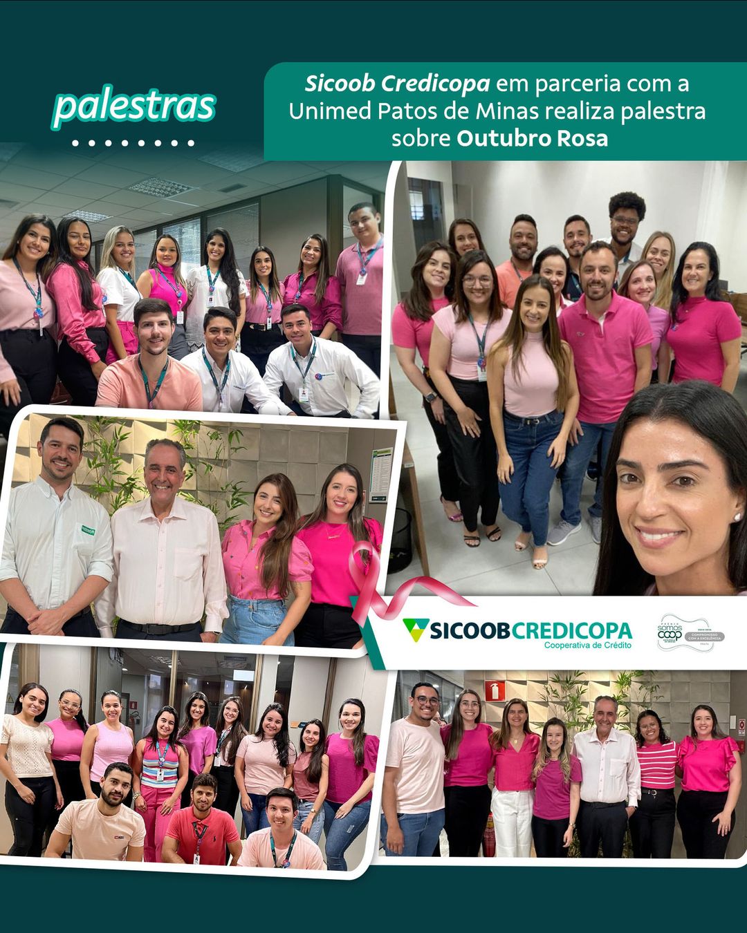 Outubro Rosa é celebrado com o objetivo de compartilhar informações e promover a conscientização sobre o câncer de mama. Durante o mês de outubro, o Sicoob Credicopa realiza uma campanha interna de conscientização, com o intuito de contribuir para a redução da incidência e da mortalidade pela doença. Na terça-feira 01/10, os colaboradores vestiram de rosa, para deixar registrado o nosso apoio a essa causa. Em parceria com a Unimed Patos de Minas, houve uma palestra com o Dra. Amanda Laboissiere Rath sobre a Saúde da Mulher com foco na prevenção do câncer de mama e câncer de útero. Com cooperação e conscientização, vamos juntos tornar todos os meses mais coloridos!