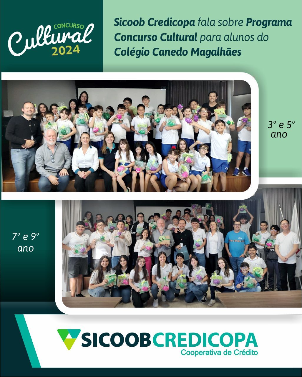 O Sicoob Credicopa recebeu alunos do 3º, 5º, 7º e 9º anos do Colégio Canedo Magalhães, onde foi ministrado uma palestra sobre cooperativismo e educação financeira para sensibilização do Programa Concurso Cultural. O Concurso Cultural tem como objetivo envolver escolas, alunos e a comunidade na promoção da cultura da cooperação. O programa incentiva a produção textual sobre temas relacionados à realidade próxima, o que permite a construção de conhecimentos que fomentam práticas mais cooperativas durante as atividades escolares. Aprender de forma cooperativa estimula a criatividade e a proatividade, desenvolve a autonomia, a responsabilidade, além de gerar um sentimento de pertencimento e acolhimento. Os alunos se sentem capazes de aprender e fazer, colocando em prática o seu conhecimento. Quando o intuito é compartilhar os benefícios se ampliam em valores como: cooperativismo, solidariedade e ajuda mútua. O Sicoob Credicopa abre seus espaços para a informação, onde a aprendizagem de conteúdos como cooperativismo, educação financeira e empreendedorismo favoreçam a inserção do aluno no dia a dia das questões sociais. Os alunos são estimulados a descobrir novos conhecimentos, refletir sobre eles e colocá-los em prática no dia a dia. O principal objetivo é que os discentes utilizem o seu aprendizado e que haja uma aplicabilidade real dos saberes.