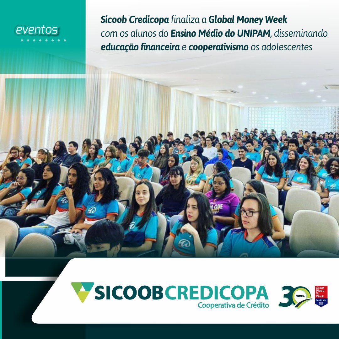 Sicoob Credicopa finalizou a sua participação na semana Global Money Week, levando conhecimentos de educação financeira e cooperativismo para alunos do ensino médio do Centro Universitário de Patos de Minas – Unipam, através da palestra Realizando Sonhos. Os voluntários transformadores do Sicoob Credicopa participaram desse momento levando os princípios sobre a educação financeira.