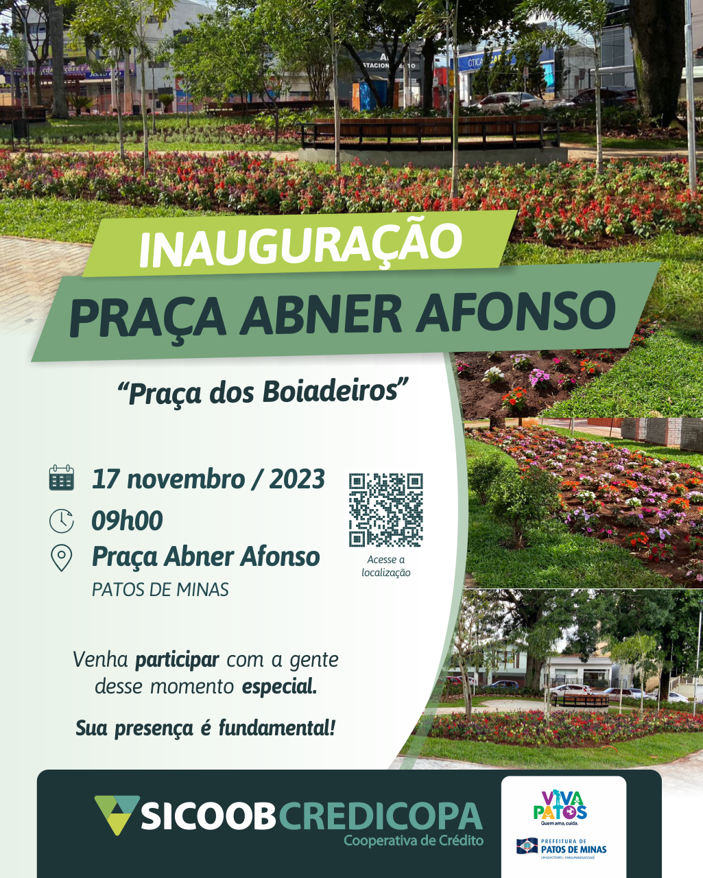 É com grande prazer que convidamos você para a inauguração da revitalização da Praça Abner Afonso “Praça dos Boiadeiros”. É um marco significativo em nossa comunidade. Um resultado do trabalho árduo e colaboração de muitos, e queremos compartilhar esse momento especial com todos vocês. Dia 17/11/2023 (sexta-feira) Horário: 09h Local: Praça Abner Afonso (Praça dos Boiadeiros) Patos de Minas Nossa praça é o coração da comunidade. Com a REVITALIZAÇÃO, ela ficou mais bonita e segura, ajudando a promover o senso de pertencimento e orgulho em nosso bairro. Juntos, podemos fazer uma grande diferença na preservação e no cuidado do espaço. Sua cooperação é fundamental para tornar este local um lugar especial e sustentável. A revitalização faz parte do projeto VIVA PATOS 2023. Uma iniciativa do Município de Patos de Minas, patrocinada pelo SICOOB CREDICOPA. Venha participar com a gente desse momento especial, a sua presença é fundamental!