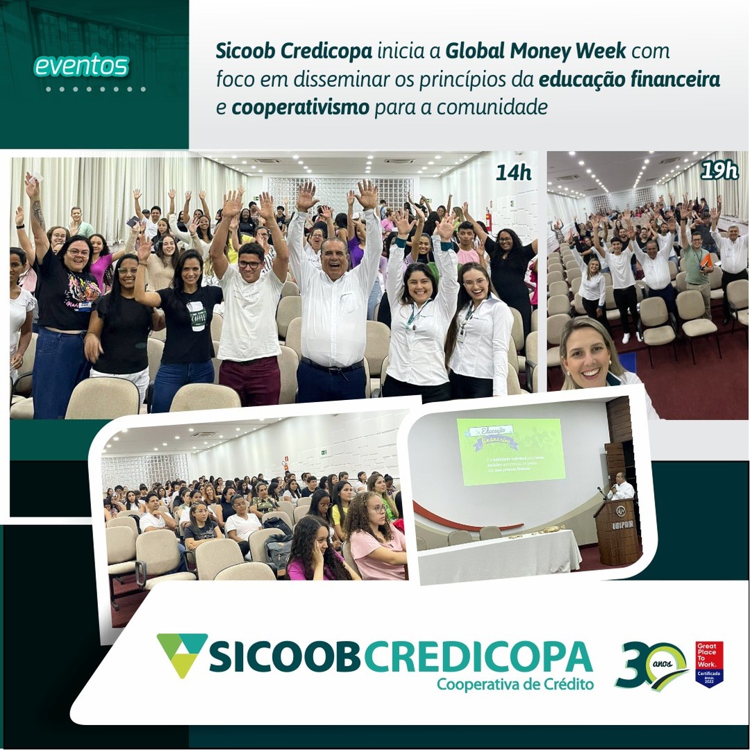 Sicoob Credicopa começou a sua participação na semana Global Money Week, levando conhecimentos de educação financeira e cooperativismo para a comunidade. Com isso, em dois turnos, os alunos do curso técnico de farmácia, segurança do trabalho, enfermagem e universitários do Centro Universitário de Patos de Minas – Unipam participaram de uma palestra sobre educação financeira com o nome Realizando Sonhos. Os voluntários transformadores do Sicoob Credicopa participaram desse momento levando à população princípios sobre a educação financeira.
