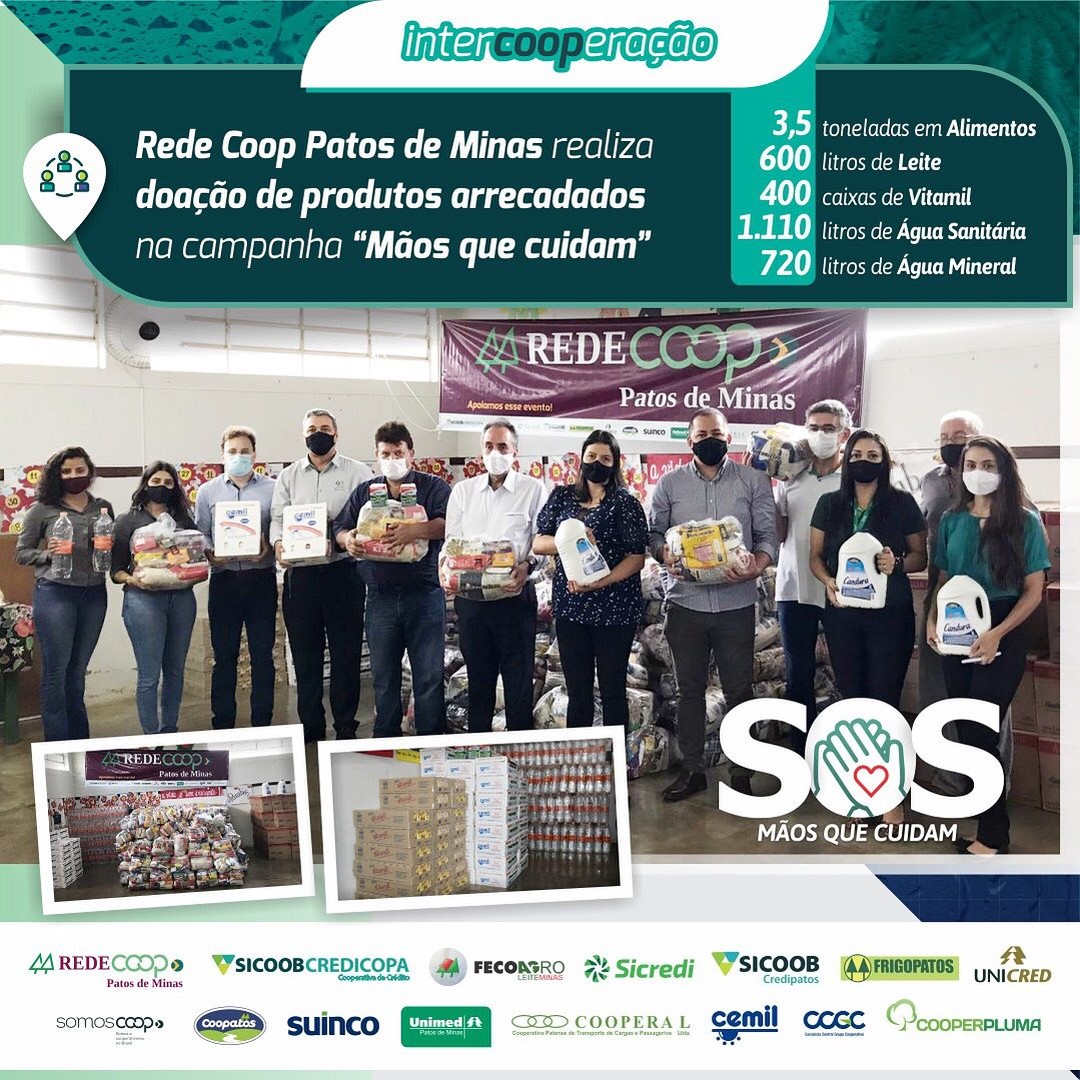 Há muito não chovia em Patos de Minas quanto nas primeiras semanas de janeiro de 2022. O Rio Paranaíba transbordou e inundações geraram danos que afetaram diretamente centenas de famílias. Como um ato de solidariedade e visando auxiliar as comunidades afetadas neste momento delicado, a Rede Coop Patos de Minas (união das 13 cooperativas) criou a campanha “SOS Mãos que Cuidam”. A ação tem como objetivo arrecadar cestas básicas, água sanitária e água mineral. Todo o material será destinado para ajudar os locais atingidos pela chuva. As entregas dos produtos arrecadados foram entregues no Projeto Viva Cristavo. Nesta primeira etapa da campanha as cooperativas arrecadaram mais de 3 toneladas e meia em alimentos, 600 litros de leite, quase 400 caixas de Vitamil, 1.110 litros de água sanitária e 720 litros de água mineral. Reforçando a força do cooperativismo, a Rede Coop Patos de Minas mostra que tem a cooperação como pilar em sua atuação. Seu propósito é conectar pessoas para promover a justiça e a prosperidade ainda mais neste momento de extrema dificuldade – que requer muita solidariedade. Ações como essa reforça o 7º princípio do cooperativismo, que é a preocupação com a comunidade. Lembrando que a campanha vai até o dia 31/01/2021. Caso queira fazer a sua doação, procure uma das cooperativas participantes e ajude quem mais precisa.