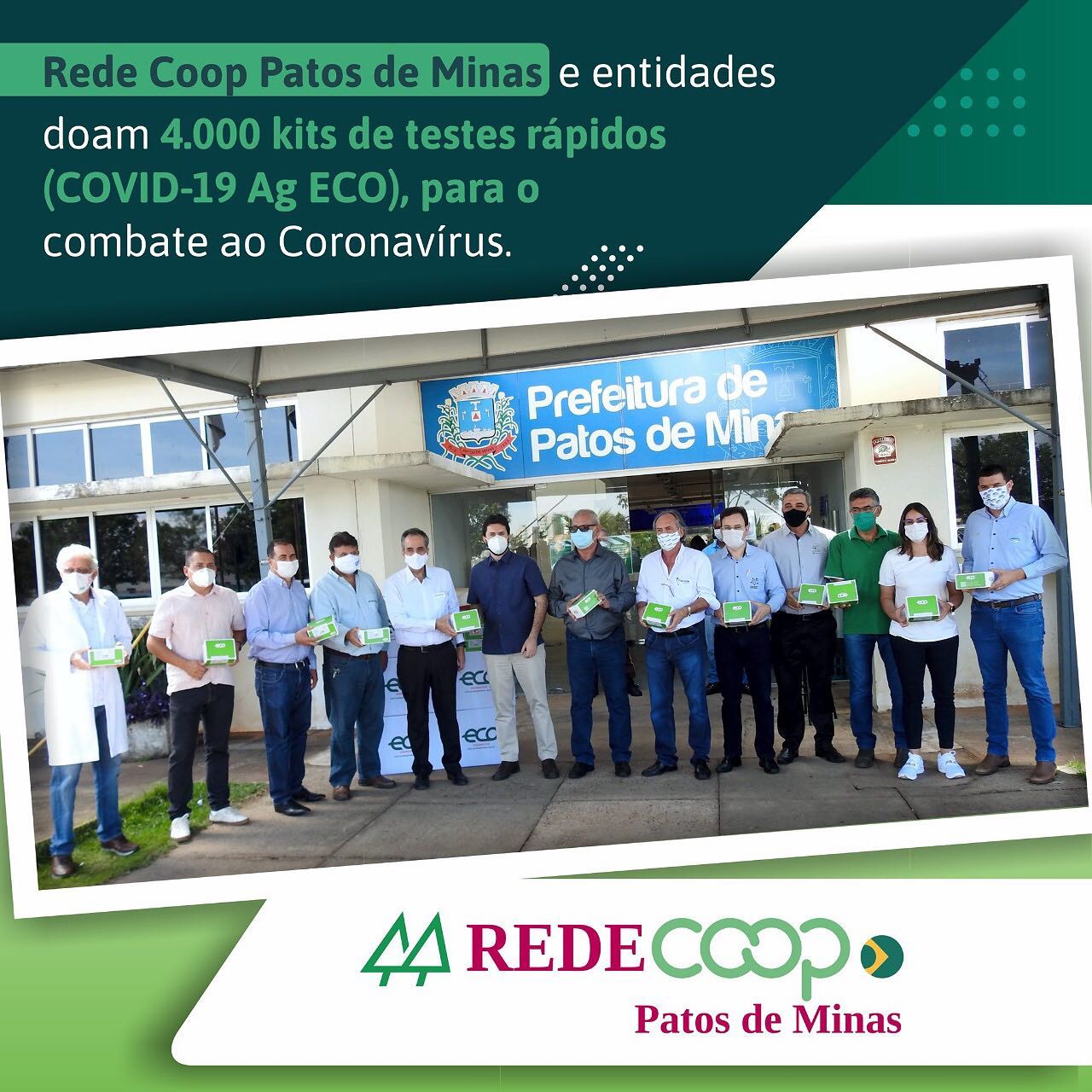 Na quarta-feira (24/03/2021), os presidentes e representantes das cooperativas que compõem a Rede Coop Patos de Minas: Ronaldo Siqueira Santos (Sicoob Credicopa); Vasco Praça Filho (Cemil e Fecoagro Leite Minas); Edmilson Garcia de Magalhães (Sicoob Credipatos), José Maria (Cooperal), Nidelson Falcão (Fecoagro Leite Minas e CCGC), Chrystien Douglas Soares (Sicredi), Vander Alvarenga (Unimed Patos de Minas), Gilberto Cunha (Coopatos e CCGC) e Dr. Julião dos Reis Tiago Araújo (vice-presidente da Unicred Integração de Minas), foram recebidos na Prefeitura Municipal de Patos, pelo prefeito Luis Eduardo Falcão e a secretária municipal de Saúde Ana Carolina Magalhães Caixeta, para realizar a entrega de 2.845 Kits de testes rápidos (COVID-19 Ag ECO), doados pela Rede Coop, para detecção do coronavírus, através de amostras Swab Nasal, em pacientes com suspeita de infecção. Na oportunidade, estavam presentes o presidente da CDL Patos de Minas, Guilherme Correia de Oliveira, que também doou mais 1000 kits e o presidente da ADESP, Walter Ferreira Soares, que doou mais 155 Kits, totalizando 4.000 kits. Os testes serão utilizados nas Unidades Básicas de Saúde (UBS). A doação tem como objetivo auxiliar a Secretaria de Saúde do município e atender a demanda existente, obtendo um diagnóstico precoce do paciente suspeito, para que o mesmo se isole e inicie o tratamento, evitando assim a transmissão para outras pessoas. De acordo com especialistas, a testagem com suspeita de contágio será decisiva para a superação da crise. O projeto surgiu através de uma iniciativa da ADESP (Agência para desenvolvimento econômico e social de Patos) e teve a parceria da Rede Coop Patos de Minas, que é representada pelas 13 cooperativas do município: Sicoob Credicopa, CCGC, Cemil, Coopatos, Cooperal, Cooperpluma, Fecoagro Leite Minas, Frigopatos, Sicoob Credipatos, Sicredi, Suinco, Unicred e Unimed Patos de Minas. Rede Coop Patos de Minas: a intercooperação em prol do desenvolvimento.