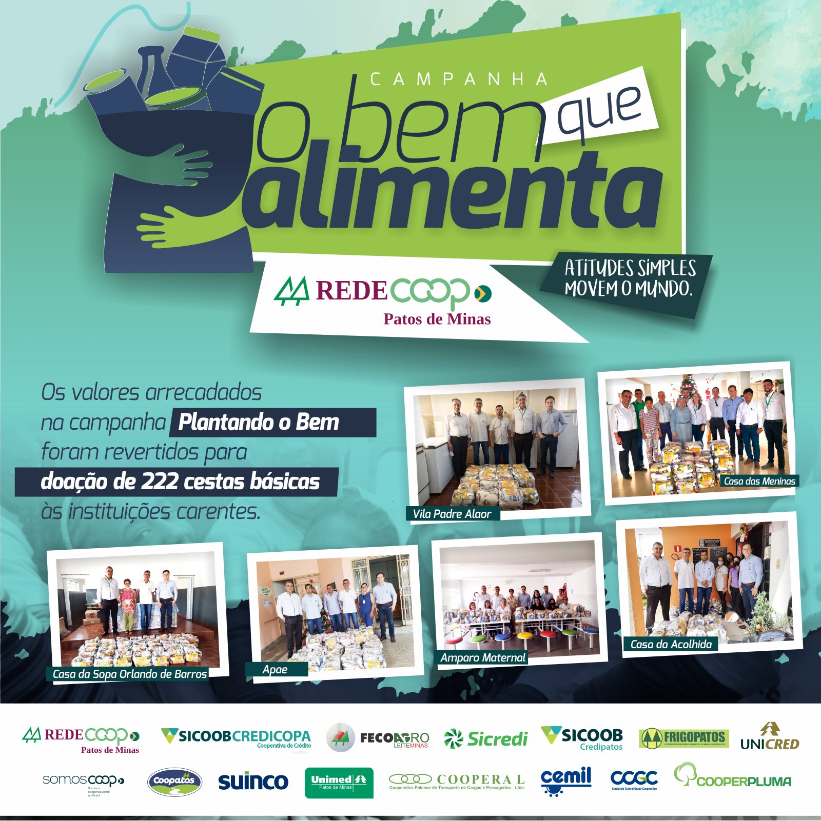 A Rede Coop Patos de Minas, através da campanha “O Bem que Alimenta”, realizou a entrega de 222 cestas básicas para seis entidades do município. Em novembro, a Rede realizou a campanha “Plantando o Bem” que além de promover a conscientização ambiental, incentivando as pessoas a plantarem mais árvores, a ação também foi social. O dinheiro arrecadado com a venda das mudas, ao valor simbólico de R$ 10,00 cada, foi revertido em 222 cestas básicas. Foram vendidas mais de 1.200 mudas e o valor arrecadado foi R$ 12.172,70 (doze mil, cento e setenta e dois reais e setenta centavos). A escolha das seis instituições (Amparo Maternal, APAE, Casa das Meninas, Casa da Acolhida, Vila Padre Alaor e Casa Sopa Ondina Vieira) foi por indicação de cada comprador das mudas que ao adquirir as mesmas sugeria qual seria beneficiada. Atitudes simples movem o mundo! Rede Coop Patos de Minas: a intercooperação em prol do desenvolvimento