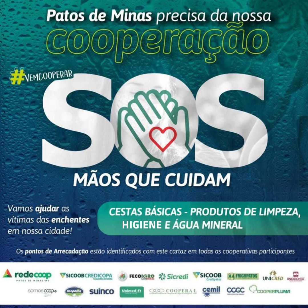 Devido a quantidade de chuvas em Patos de Minas nas primeiras semanas de janeiro de 2023, o Rio Paranaíba transbordou e inundações geram danos que afetam muitas amílias, deixando quase 100 pessoas desabrigadas ou desalojadas. Como ato de solidariedade e visando auxiliar as comunidades afetadas neste momento delicado, a Rede Coop Patos de Minas (união das 14 cooperativas) comunica o retorno da campanha “SOS Mãos que Cuidam” que inicio na sexta-feira (13/01). A ação tem como objetivo arrecadar alimentos não perecíveis, produtos de higiene e limpeza e água mineral. Todo o material será destinado para ajudar as famílias cujas residências foram atingidas pela chuva. As entregas dos produtos arrecadados serão feitas para a Secretaria de Desenvolvimento Social. Reforçando o compromisso do cooperativismo, a Rede Coop Patos de Minas mostra que tem a solidariedade como pilar em sua atuação. Seu propósito é conectar pessoas para promover a justiça e a prosperidade, especialmente neste momento de extrema dificuldade – que requer muita empatia e empenho social. Para colaborar, basta levar o(s) produto(s) em qualquer uma das cooperativas participantes e assim, ajudar quem mais precisa. Ações como essa reforçam o 7º princípio do cooperativismo, que é a preocupação com a comunidade.