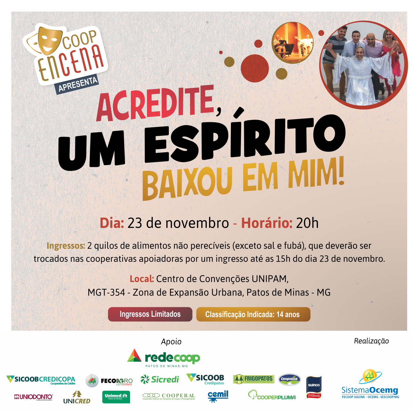 A Rede Coop Patos de Minas (união das 14 cooperativas) traz o espetáculo “Acredite, um espír ito baixou em mim” - Comédia que conta a história de um homem que, inconformado com a própria morte, foge do céu para viver novas experiências e acaba criando uma grande confusão após incorporar num machista radical.