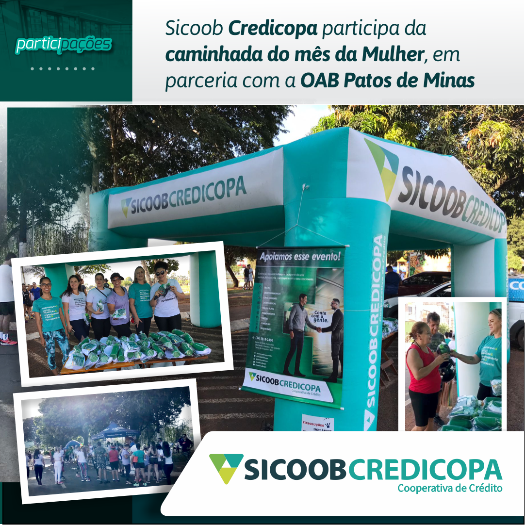 A OAB - 45ª Sub. Patos de Minas promoveu, neste sábado (26/3), a "Caminhada da Mulher" em comemoração ao mês da mulher. O evento, aberto para a comunidade, aconteceu na orla da Lagoa Grande e contou com a participação do Sicoob Credicopa, que montou um stand e distribuiu brindes aos participantes.