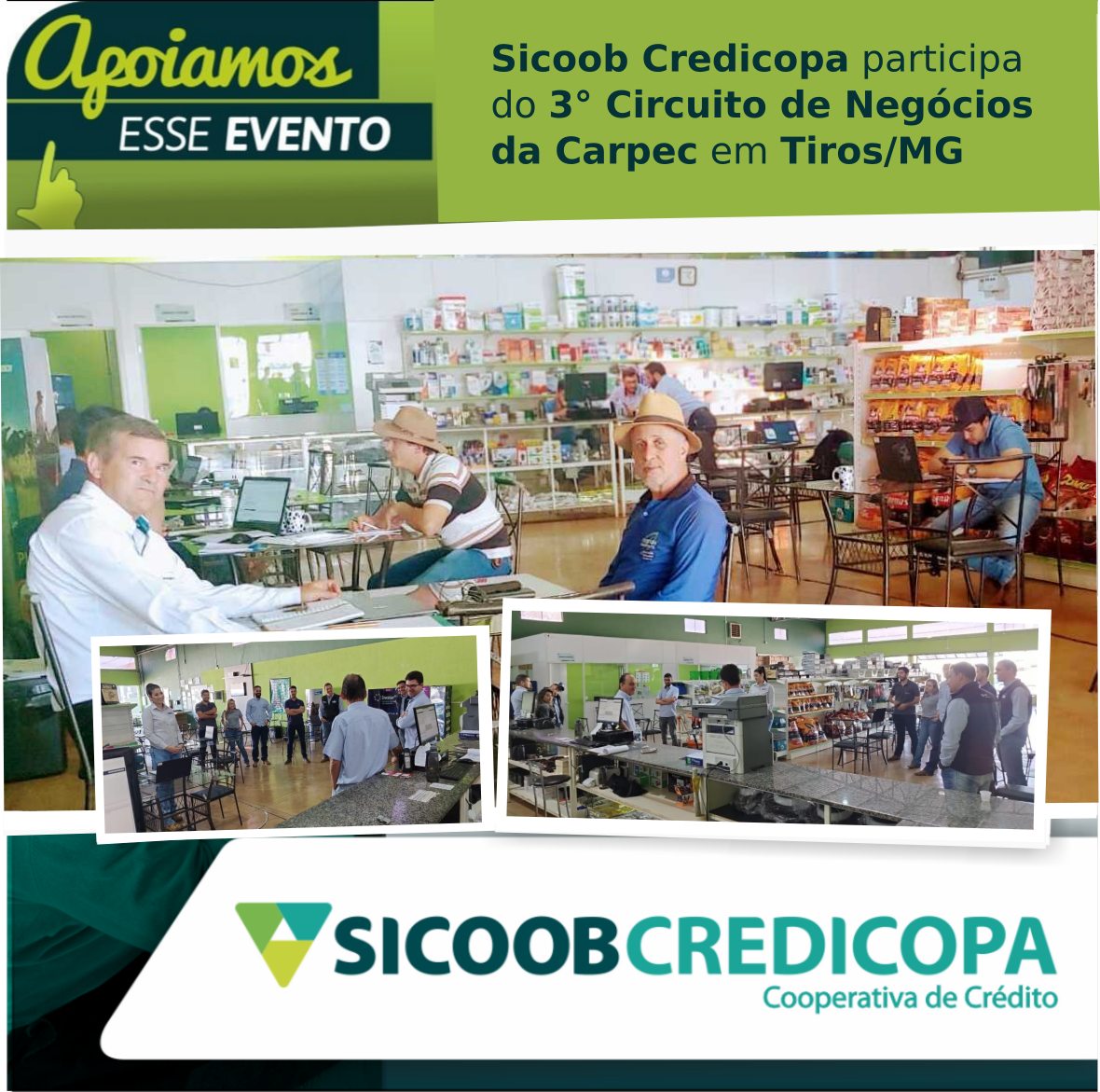 O Sicoob Credicopa é parceiro e está presente, até 15 de julho, no 3º Circuito de Negócios Carpec, na cidade de Tiros. O nosso gerente César Alves Da Silva espera por você que quer fazer o melhor negócio para seu empreendimento. Venha nos visitar na unidade da Carpec de Tiros, na Rua Padre José Coelho, 840.