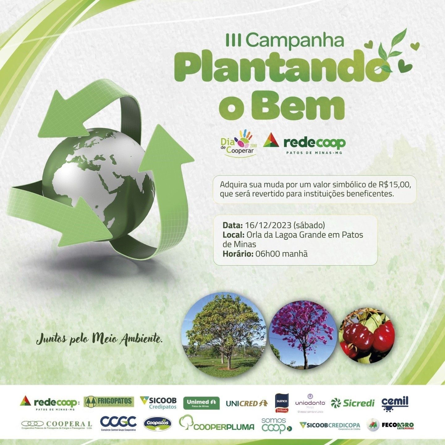 Preocupada com o meio ambiente e com a comunidade, a RedeCoop Patos de Minas realizará a III Campanha Plantando o Bem! A ação será no dia 16 de dezembro, sábado, às 06 da manhã, na orla da Lagoa Grande, em Patos de Minas, e consiste na doação de mudas por um valor simbólico, com a arrecadação sendo revertida para instituições beneficentes de nossa cidade. Não perca a oportunidade de ajudar o planeta e ainda recuperar com a sociedade. Contamos com seu apoio!