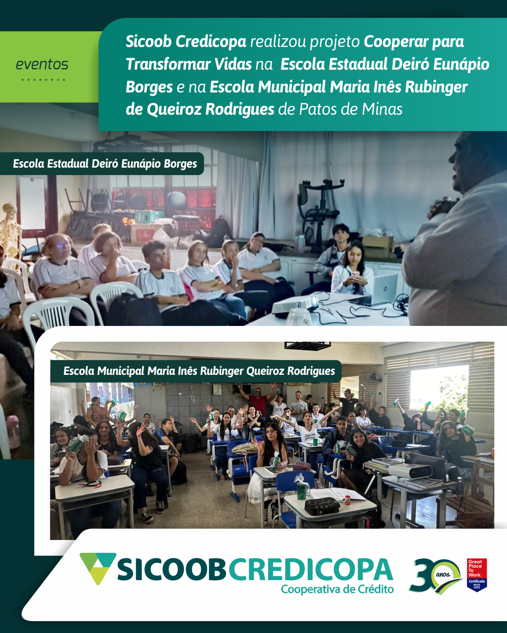 O Sicoob Credicopa realizou no dia 31/10 na Escola Estadual Deiró Eunápio Borges e 01/11 na Escola Municipal Maria Inês Rubinger de Queiroz Rodrigues o projeto Cooperar para Transformar Vidas. O diretor administrativo e coordenador, Milton Roberto, mostrou as crianças e adolescentes a importância do cooperativismo e da educação financeira. Os voluntários transformadores da cooperativa participaram e ao final distribuiram brindes. “Com o objetivo de construir um futuro mais justo, nós do Sicoob Credicopa acreditamos que ao educarmos as próximas gerações com os valores e importância do cooperativismo financeiro, estaremos construindo uma comunidade melhor. Agradecemos à direção, professores e alunos das escolas.", diz o diretor administrativo e coordenador, Milton Roberto.