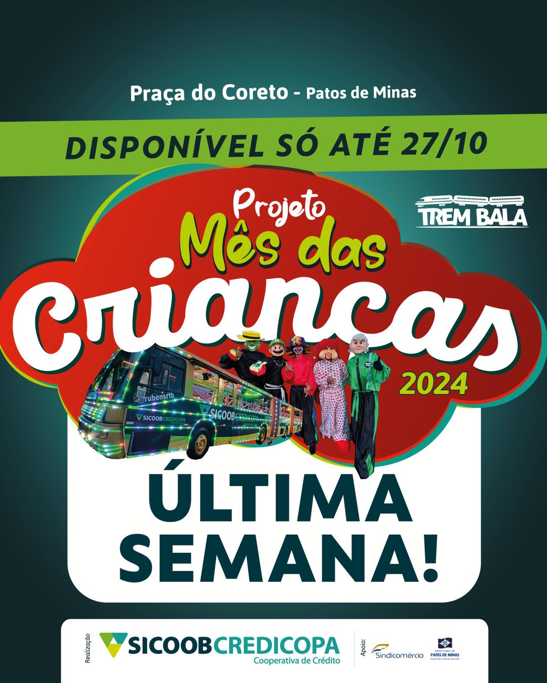 Estamos na última semana! Venham se divertir com a gente no Mês das Crianças do Sicoob Credicopa - Cooperar e Semear Sorrisos! Comprando a partir de R$ 50,00 nas lojas identificadas, você ganha ingresso para usar na carreta. Os passeios duram cerca de 30 minutos, até sexta das 17h às 22h, no sábado das 9h às 13h e 16h às 22h e no domingo das 16h às 22h. Lembrando que, tem pula-pula, escorregador, cama elástica, centopeia e tobogã. Os brinquedos na Praça do Coreto são gratuitos. Venha se divertir com a gente! A diversão vai só até domingo (27/10).