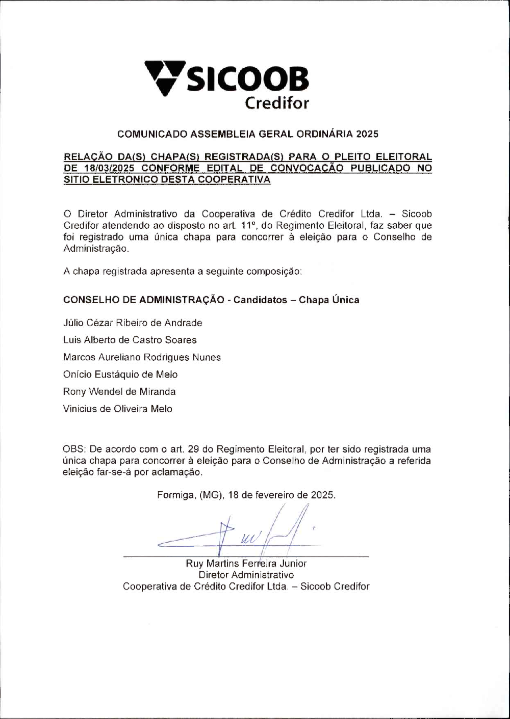 Relação de Chapa(s) Registrada(s) para o Pleito Eleitoral de 18.03.2025