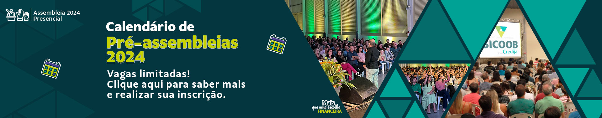 O Sicoob Credija dará início no dia 15 de fevereiro, em Morrinhos do Sul (RS), à primeira das 19 pré-assembleias de 2024, que se estenderão até abril. Após todas as pré-assembleias haverá a Assembleia Geral Ordinária, em Jacinto Machado (SC), no dia 19 de abril, às 19h30, no pavilhão do CDC (Campo Demonstrativo Cooperja).