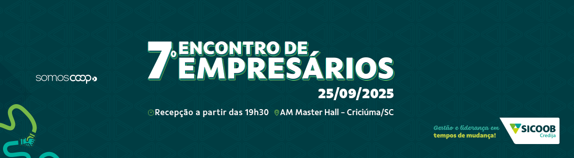 O 7º Encontro de Empresários, promovido pelo Sicoob Credija, já tem data marcada e promete ser mais uma noite de conhecimento e troca de experiências. O evento acontece no dia 25 de setembro, a partir das 19h30, no AM Master Hall, em Criciúma/SC.