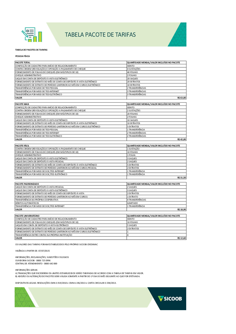 TABELA DE PACOTES DE TARIFAS PF