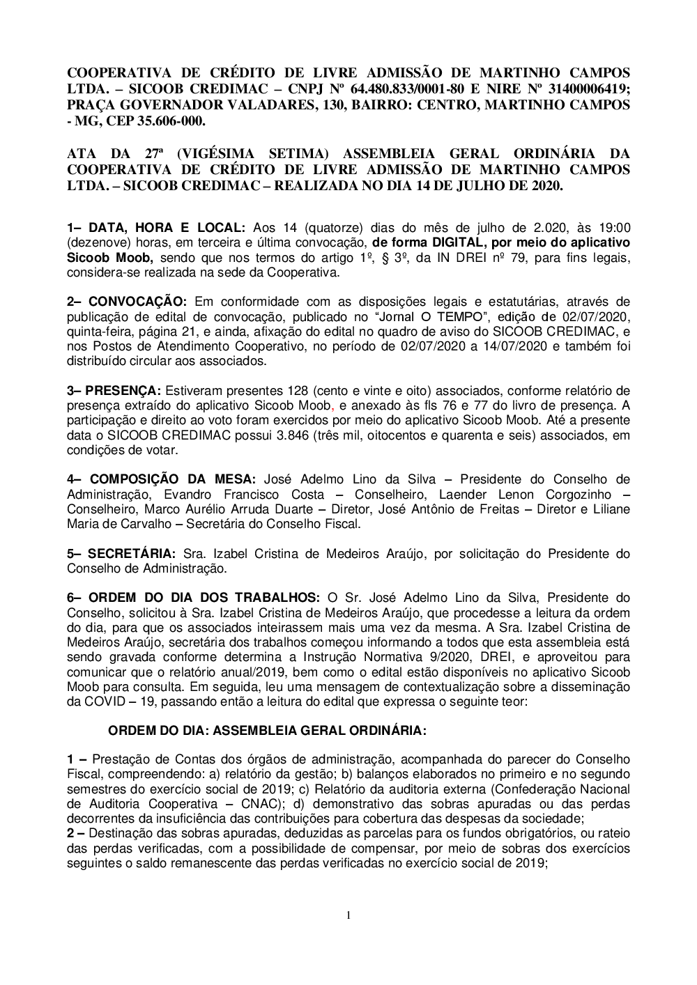 ATA DA 6a (SEXTA) ASSEMBLÉIA GERAL ORDINÁRIA DA COOPERATIVA DE CRÉDITO RURAL DE MARTINHO CAMPOS LTDA – CREDIMAC – REALIZADA NO DIA 26 DE MARÇO DE 1