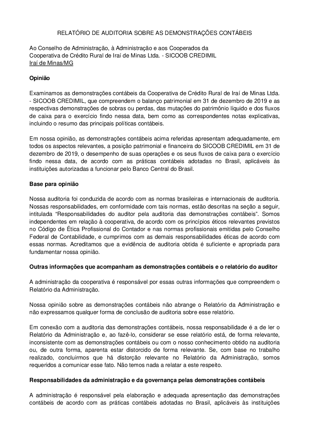 Relatório de Auditoria 2019 SICOOB Credimil