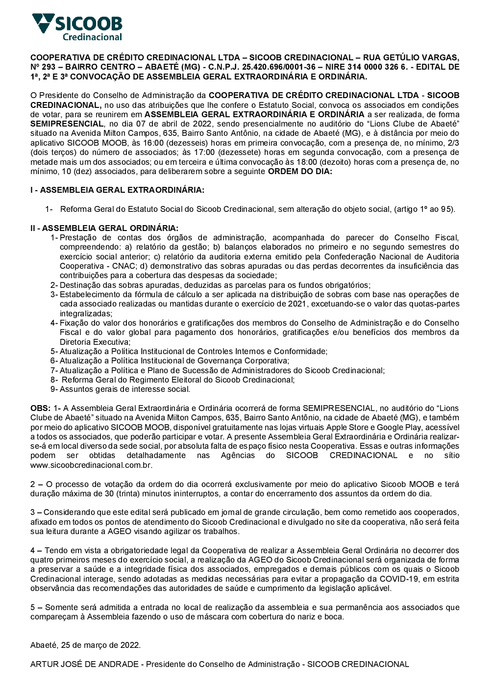 - Edital de 1ª, 2ª e 3ª convocação de Assembleia Geral Extraordinária e Ordinária
