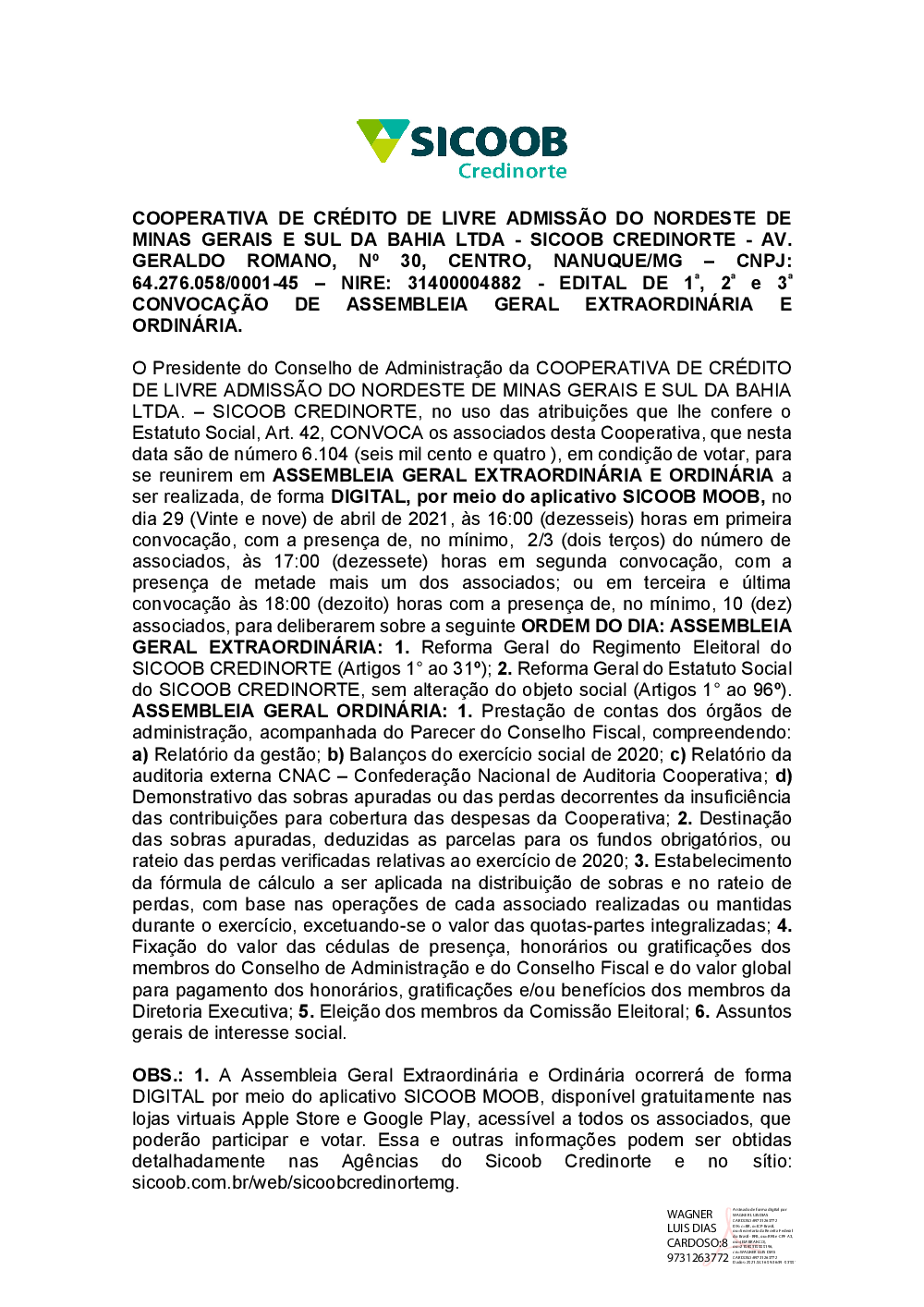 COOPERATIVA DE CRÉDITO RURAL DOS PLANTADORES DE CANA E PRODUTORES RURAIS DO NORDESTE DE MINAS E SUL DA BAHIA LTDA - CREDINORTE - Av