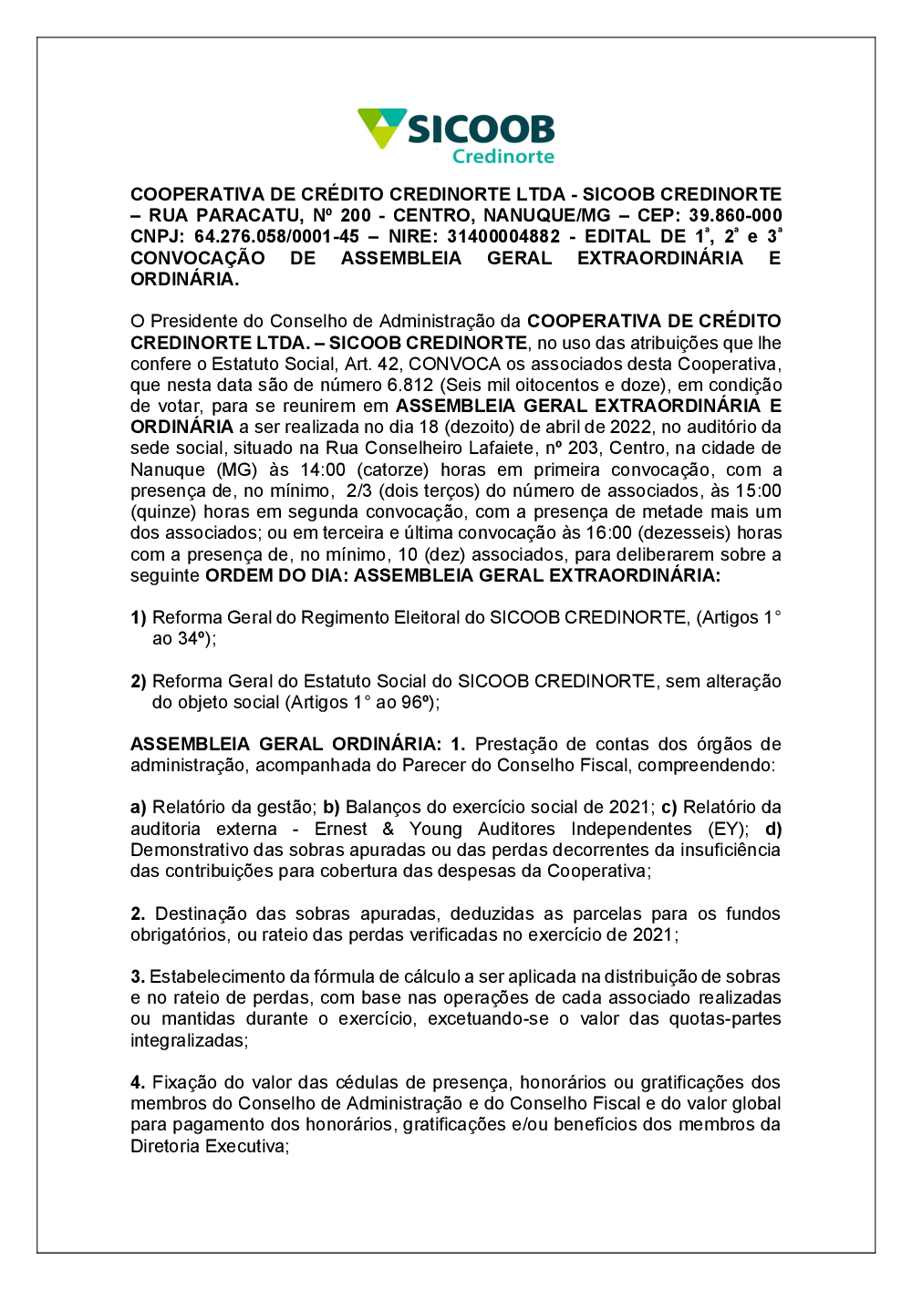 COOPERATIVA DE CRÉDITO RURAL DOS PLANTADORES DE CANA E PRODUTORES RURAIS DO NORDESTE DE MINAS E SUL DA BAHIA LTDA - CREDINORTE - Av