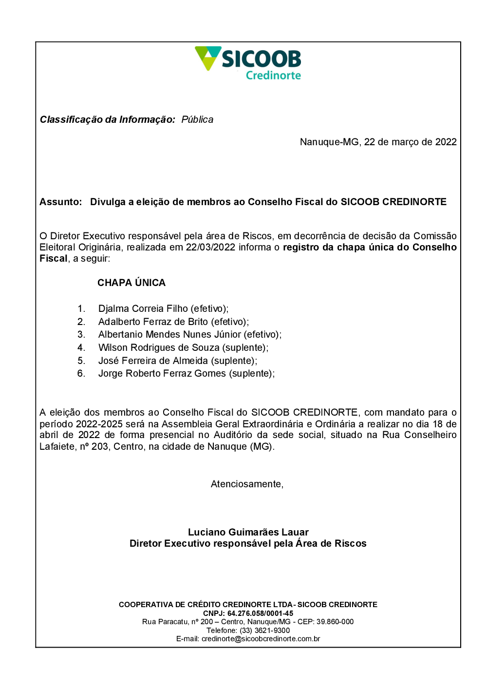 - Divulga a eleição de membros ao Conselho Fiscal do SICOOB CREDINORTE 22/02/2022