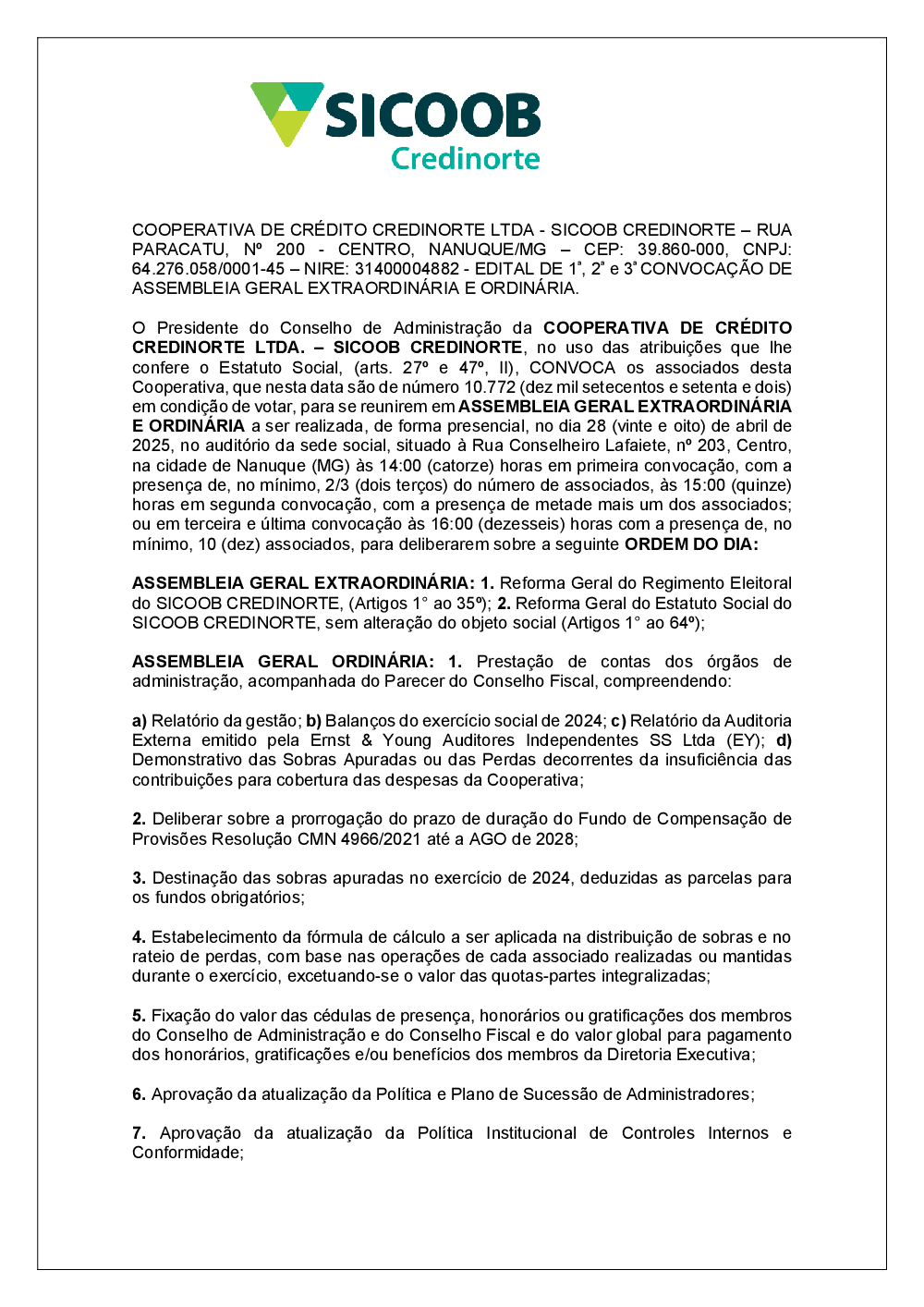 COOPERATIVA DE CRÉDITO RURAL DOS PLANTADORES DE CANA E PRODUTORES RURAIS DO NORDESTE DE MINAS E SUL DA BAHIA LTDA - CREDINORTE - Av
